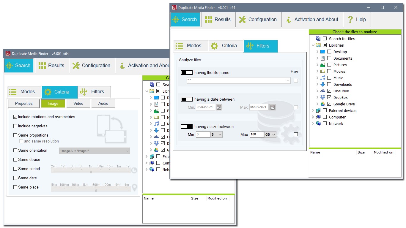 Free up storage space by deleting redundant files, you will free up space on your hard drives, smartphones or cloud (OneDrive, DropBox, Google Drive, iCloud, MEGA, pCloud, Box, etc.).Simple to use: All you need to do is check the folders to analyze and DMF will do the rest.Sort your holiday photos: Manage your holiday photos, delete the duplicates, and save the best ones.One single software to scan your PC and the peripheral devices connected to it (smartphones, tablets, Cloud...).To make them more visible, Duplicate Media Finder displays the file contents directly as windows thumbnails!Automatic selection of duplicates to delete.Duplicate Media Finder can effectively analyze hundreds of thousands of files. It is ideal if you have a large media library!An extremely high-performance software! DMF takes full advantage of new multicore processes, and can even carry out several searches at the same time.DMF is intended for individuals as well as for professionals.It offers all the functionalities necessary to facilitate your work (sorting, decision support...).DMF can identify similar photos among several formats (psd, bmp, gif, jpeg, jfif, jpeg 2000, png, heic, ico, tga, pcx, pbm, sgi, tiff), as well as main RAW files.DMF can identify similar films among a multitude of formats (3g2, 3gp, asf, asx, avi, bsf, divx, f4v, flv, m2p, m2v, m4v, mkv, mov, mp4, mpeg, mpg, ogv, ts, vob, webM, wmv, xvid).DMF can identify similar music among several formats (mp3, ogg, oga, ac3, flac, m4a(aac & alac), mp2, wav, wma, opus, wv, amr).DMF can find and delete identical folders