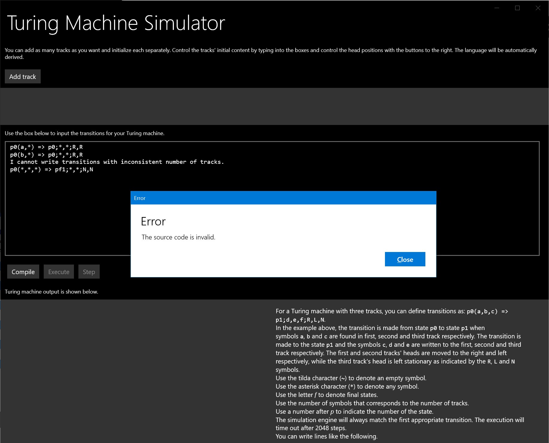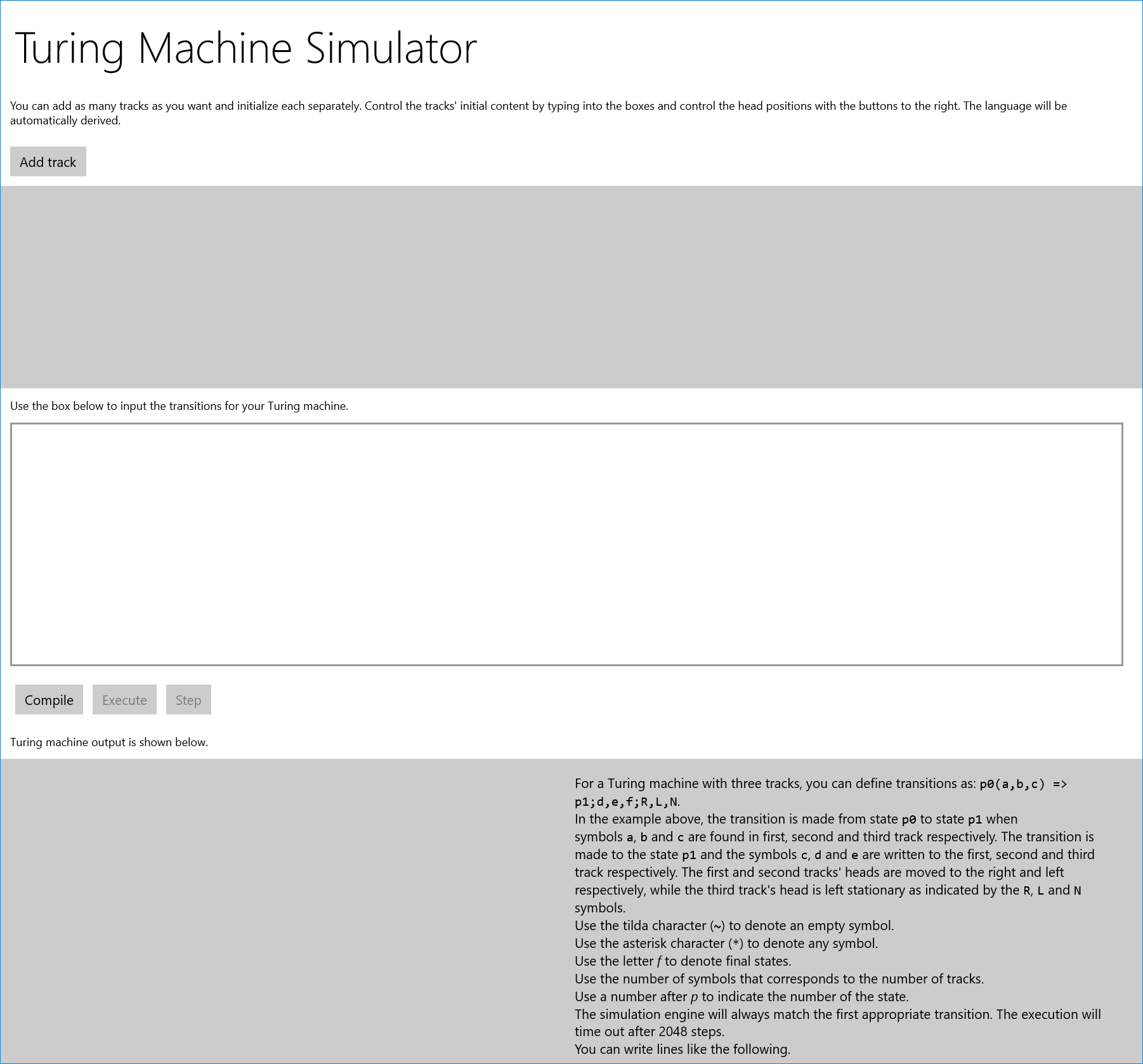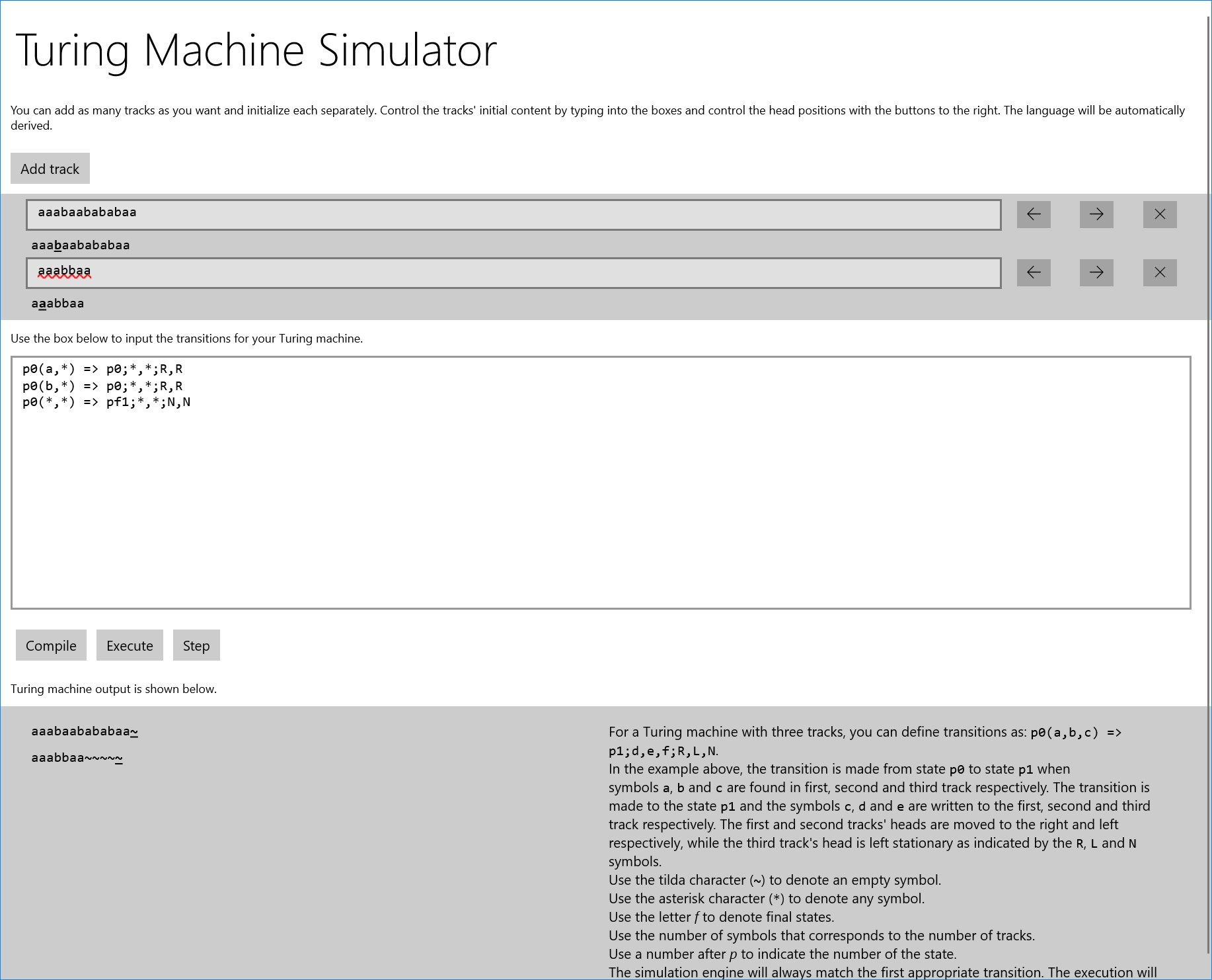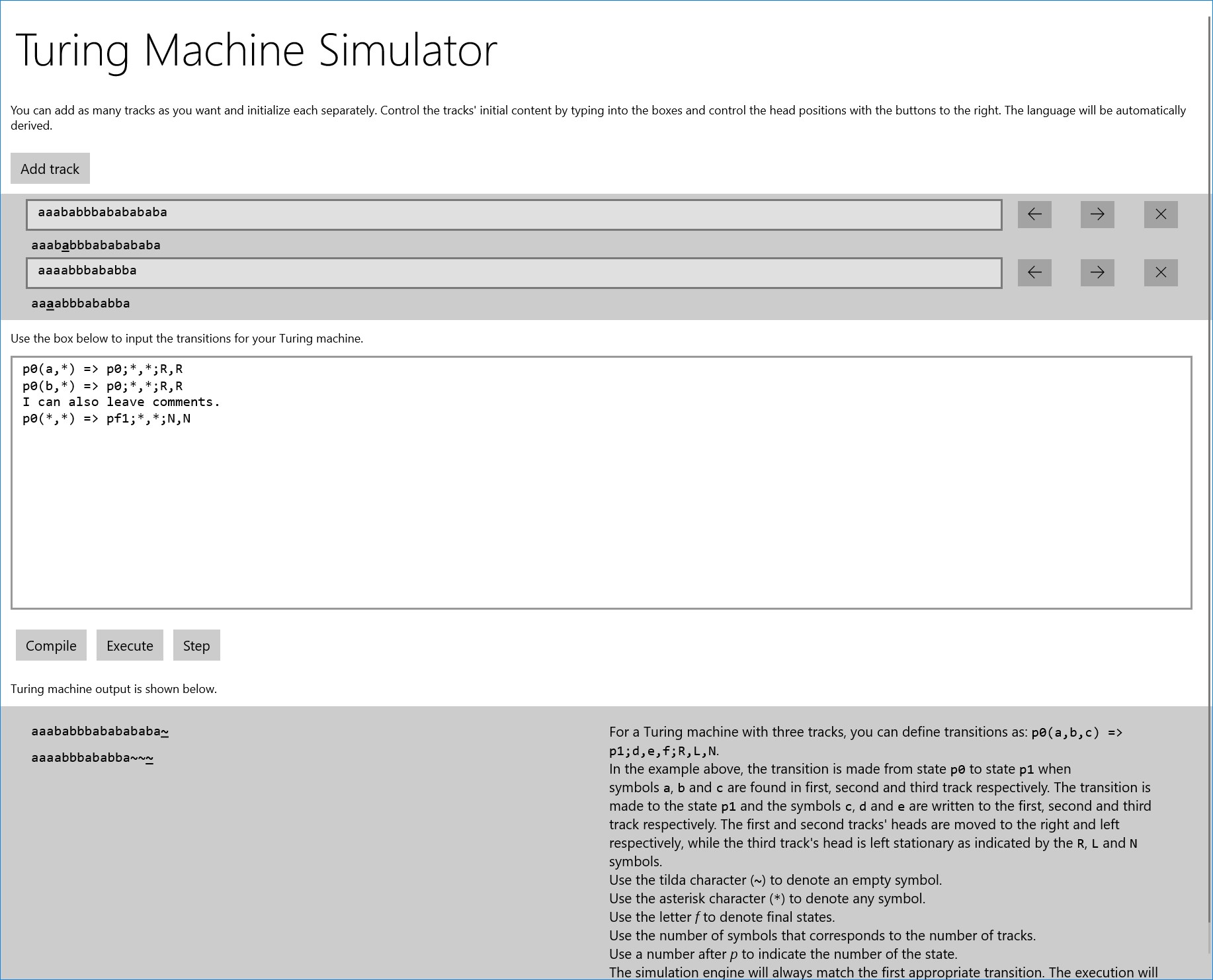 With Turing Machine Simulator, you can write your own transitions for Multitrack Turing Machines and execute them step by step. This is a learning aid for students looking into automata theory and abstract computation models. You can use any number of tracks with customizable track initializations.