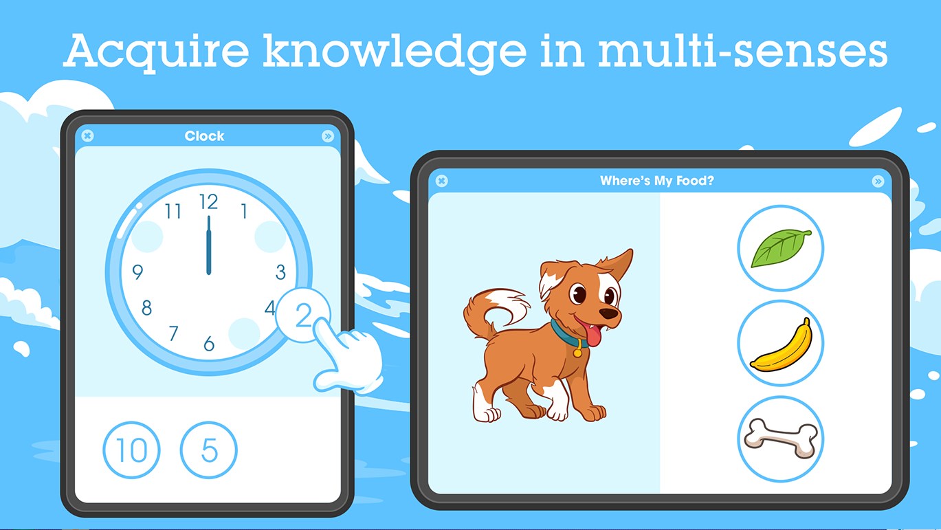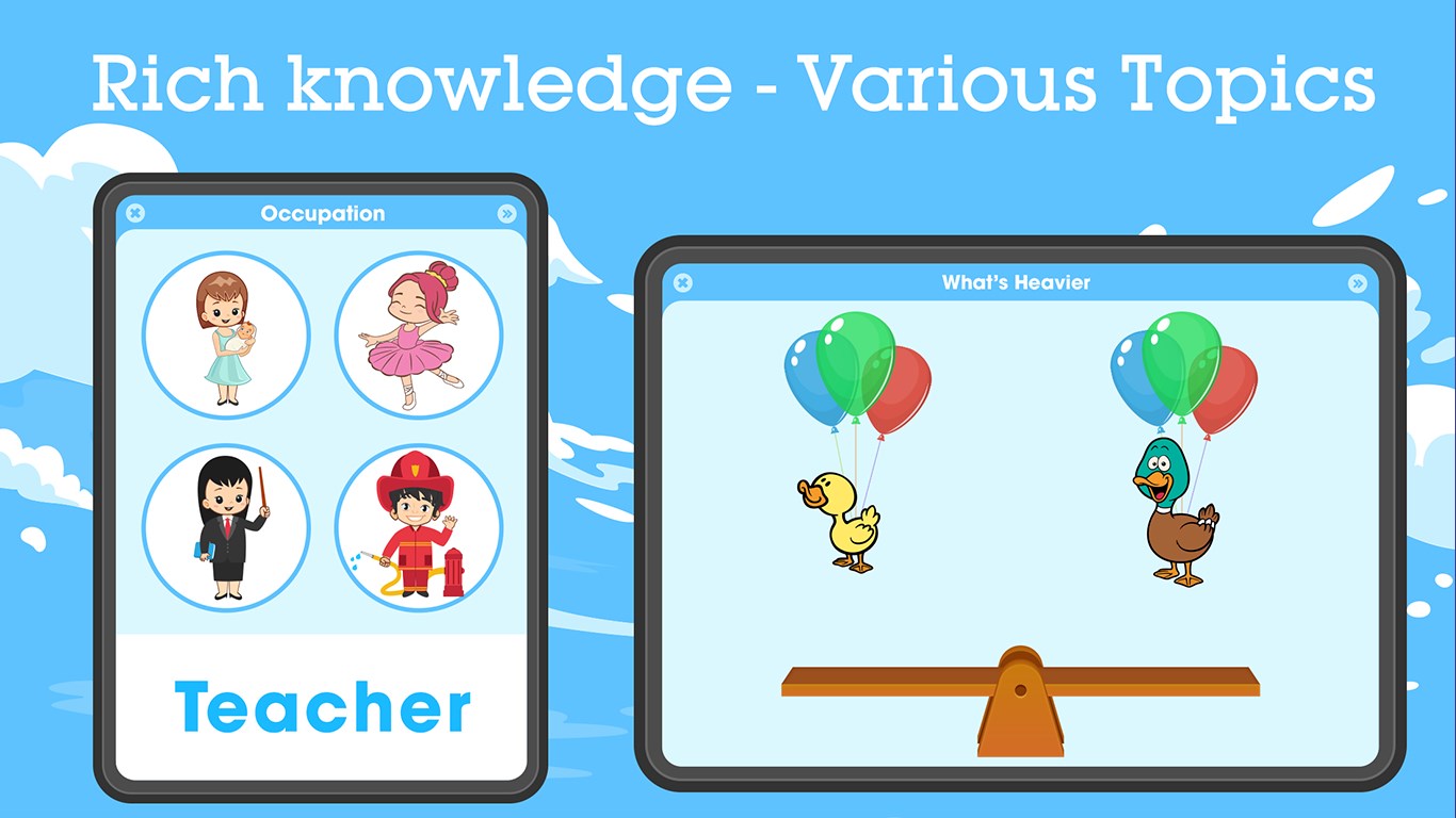 Each lesson lasts from 5 to 7 minutes, starting with the introduction of the subject and vocabulary via flash-card, then the child will play and study the topic through the brain game.