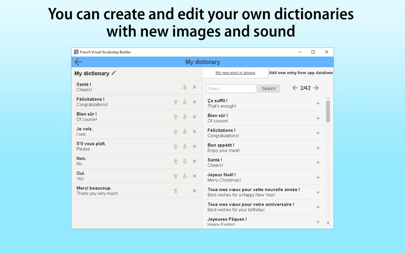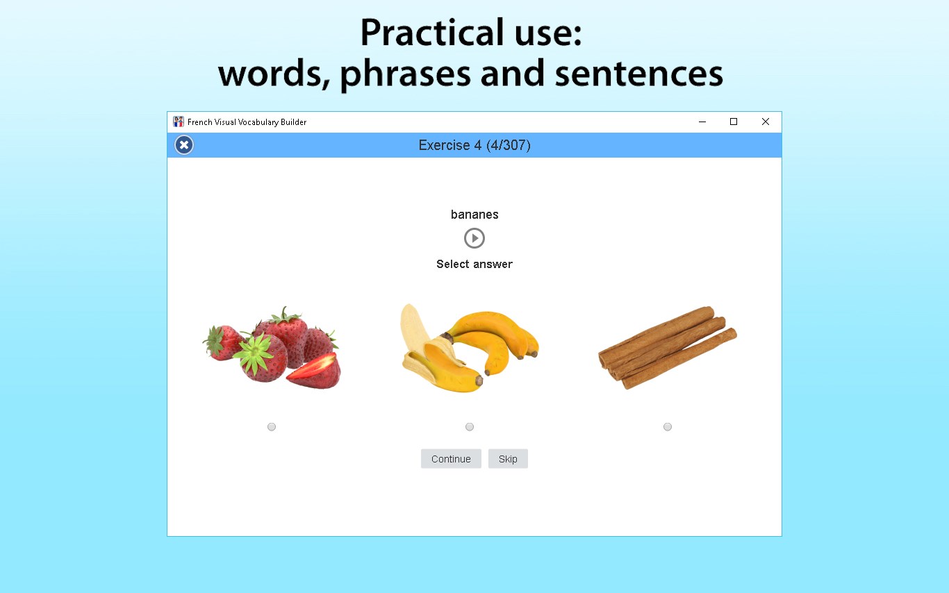 Thanks to our unique learning method, you will soon achieve great results on the path to mastering French. Vocabulary Builder is ideal for anyone wishing to learn some words and phrases for use on holiday, as well as those looking to brush up their language skills.