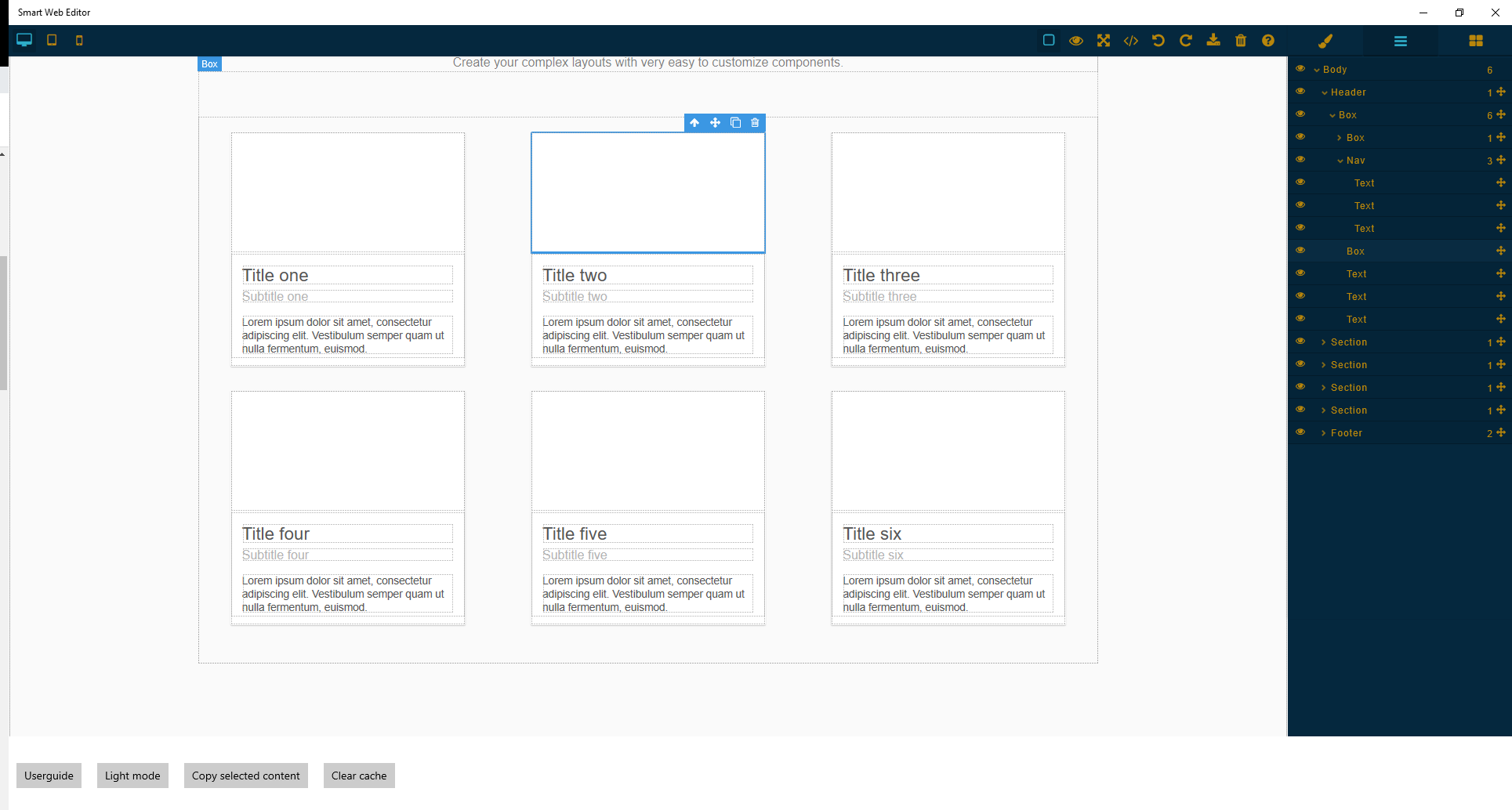 Web designer environment Create HTML and CSS content without codePossibility to extract the HTML and CSS pagesLIght/Dark mode option