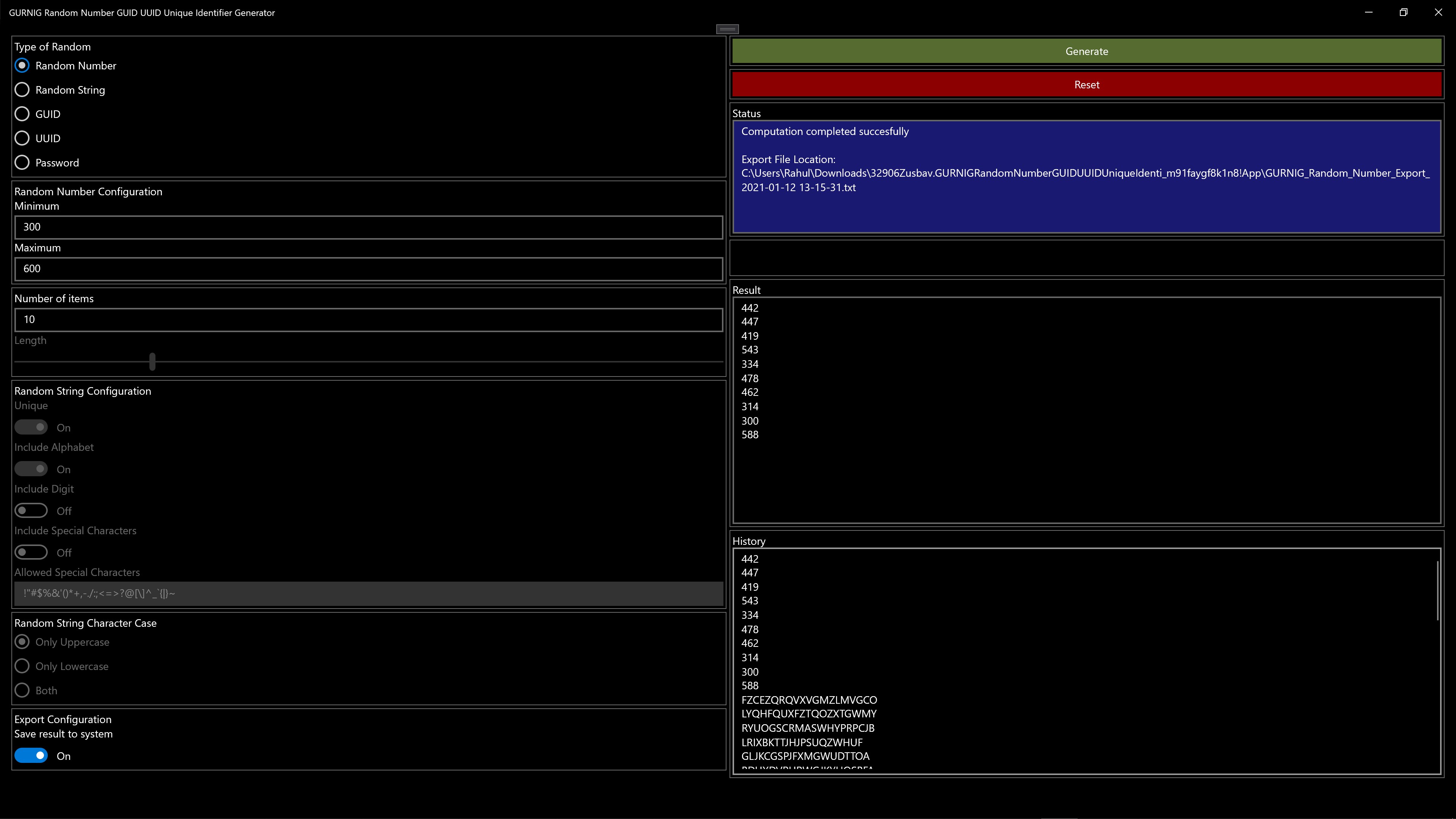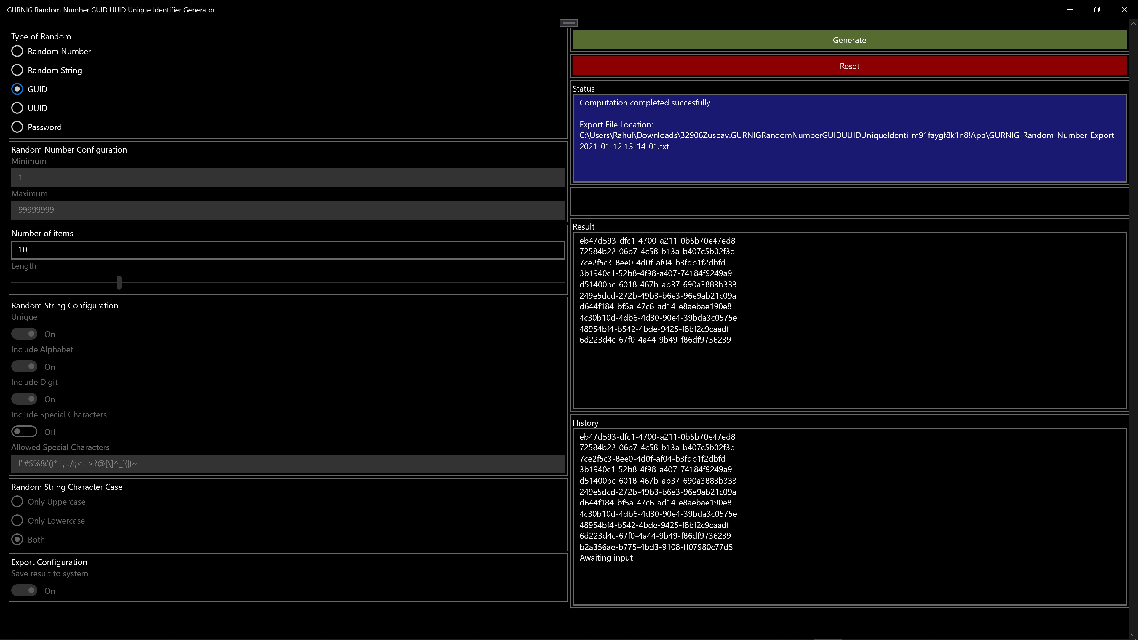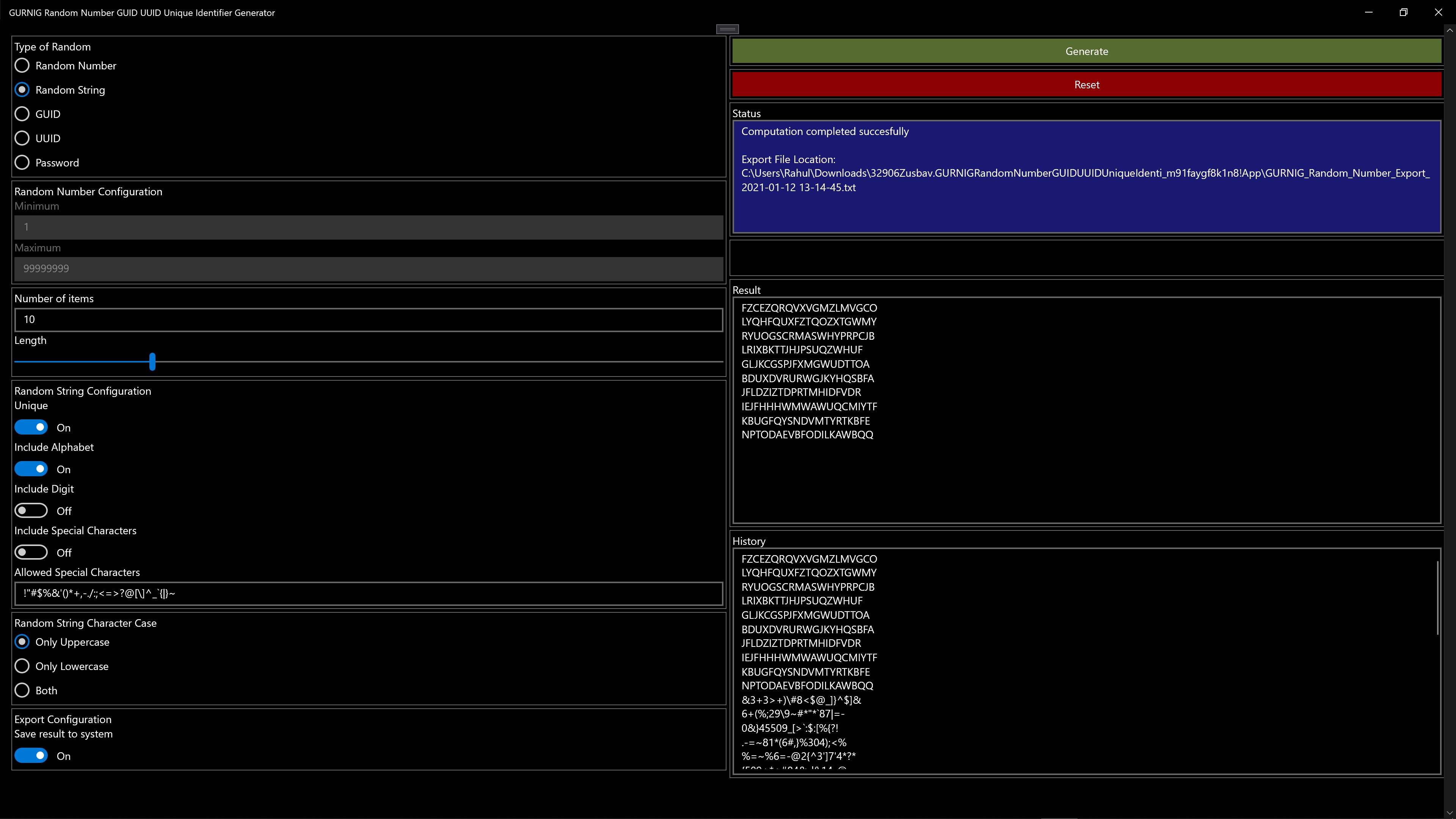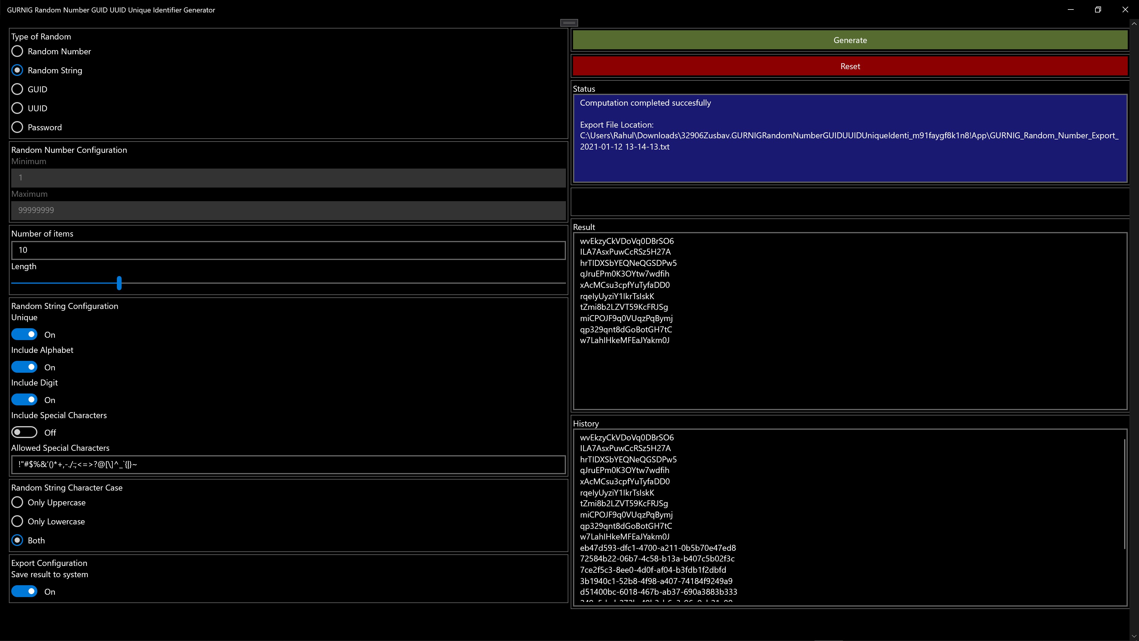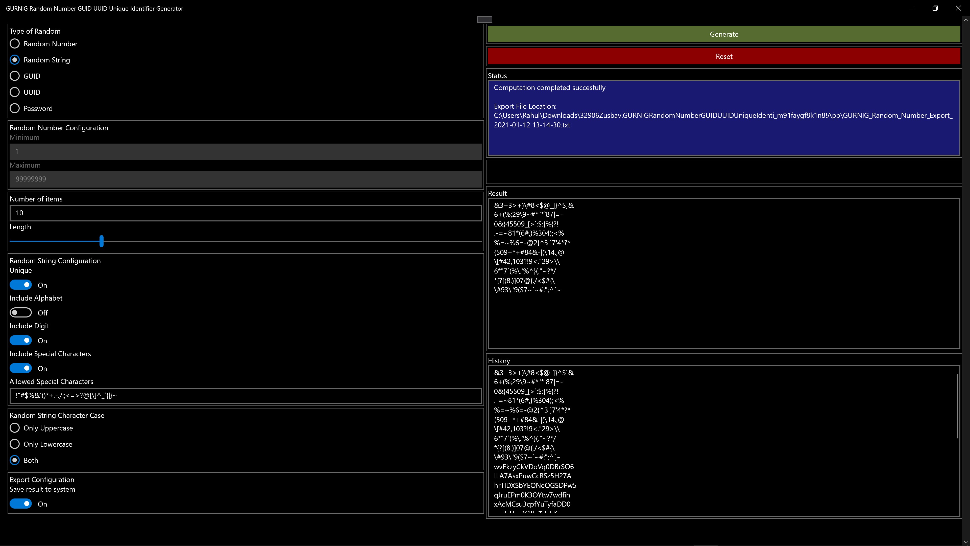 This application allows you to generate random strings, random numbers, GUID, UUID, password based on pure entropy seed sources. This random string generator can be used for quick unique data for analysis, unique file names, password.