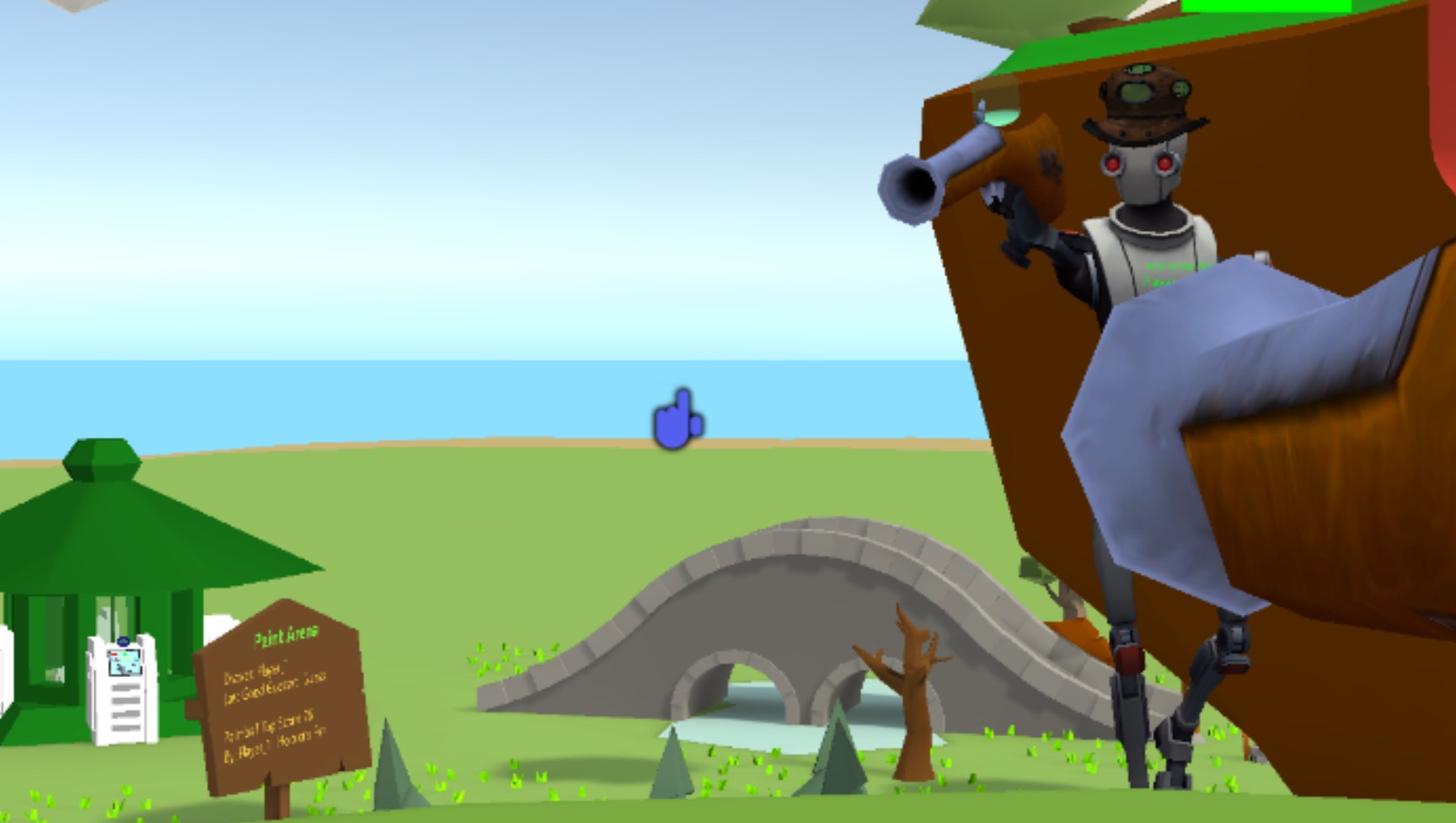 In Immersive headsets: Make sure you set up boundary for all experiences before you begin. While "Painting On", once you see your robotic right hand holding a paint brush, you can press the right hand trigger button to start drawing. While "Paint Balling", you can aim with your right hand controller, and press right hand trigger to shoot paintballs.