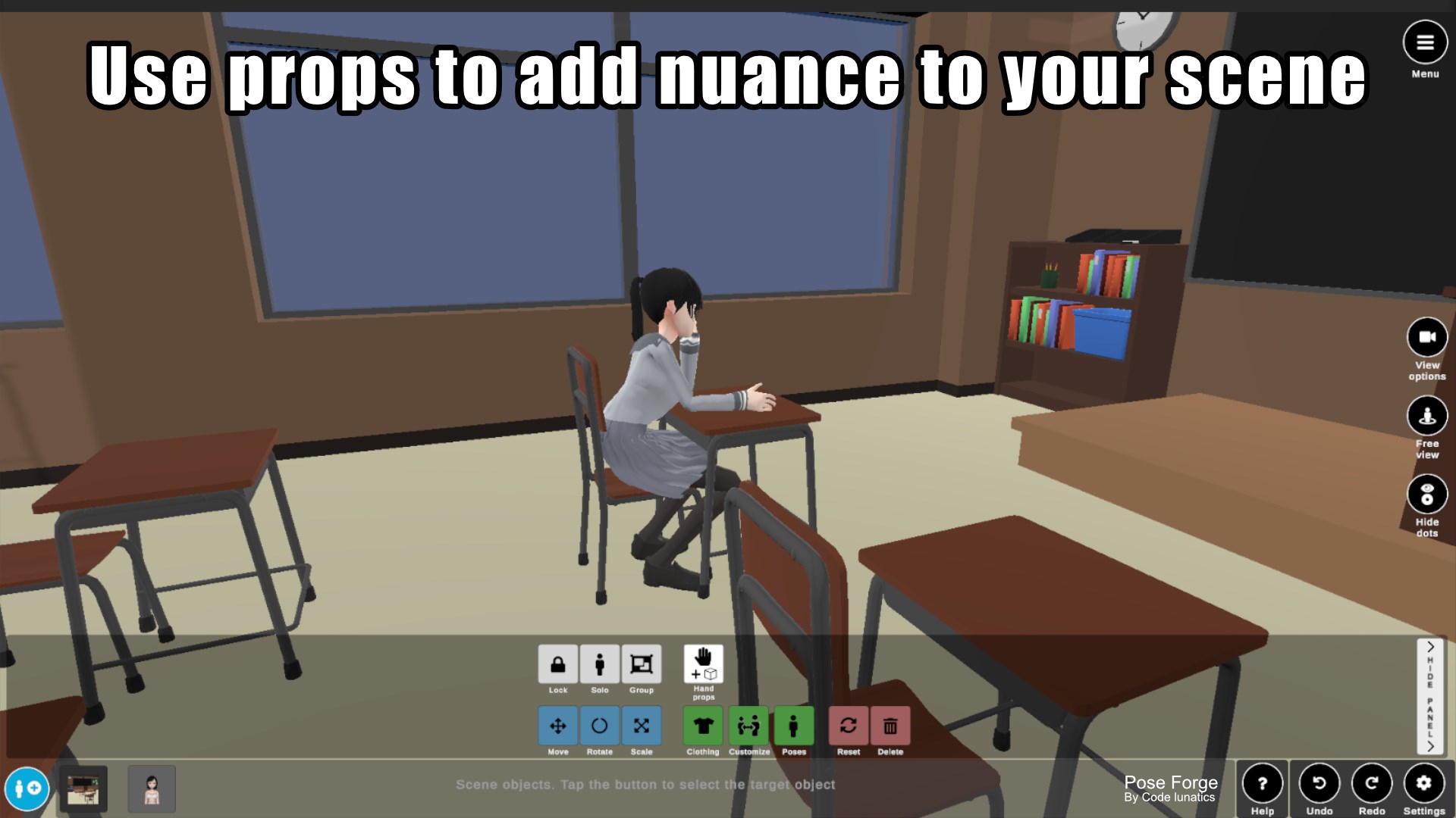Enrich the scene with props! Add chairs, tables, weapons, vehicles, trees and geometry shapes to scene. You can also attach props directly to models hands; Props then follows the hand movement.