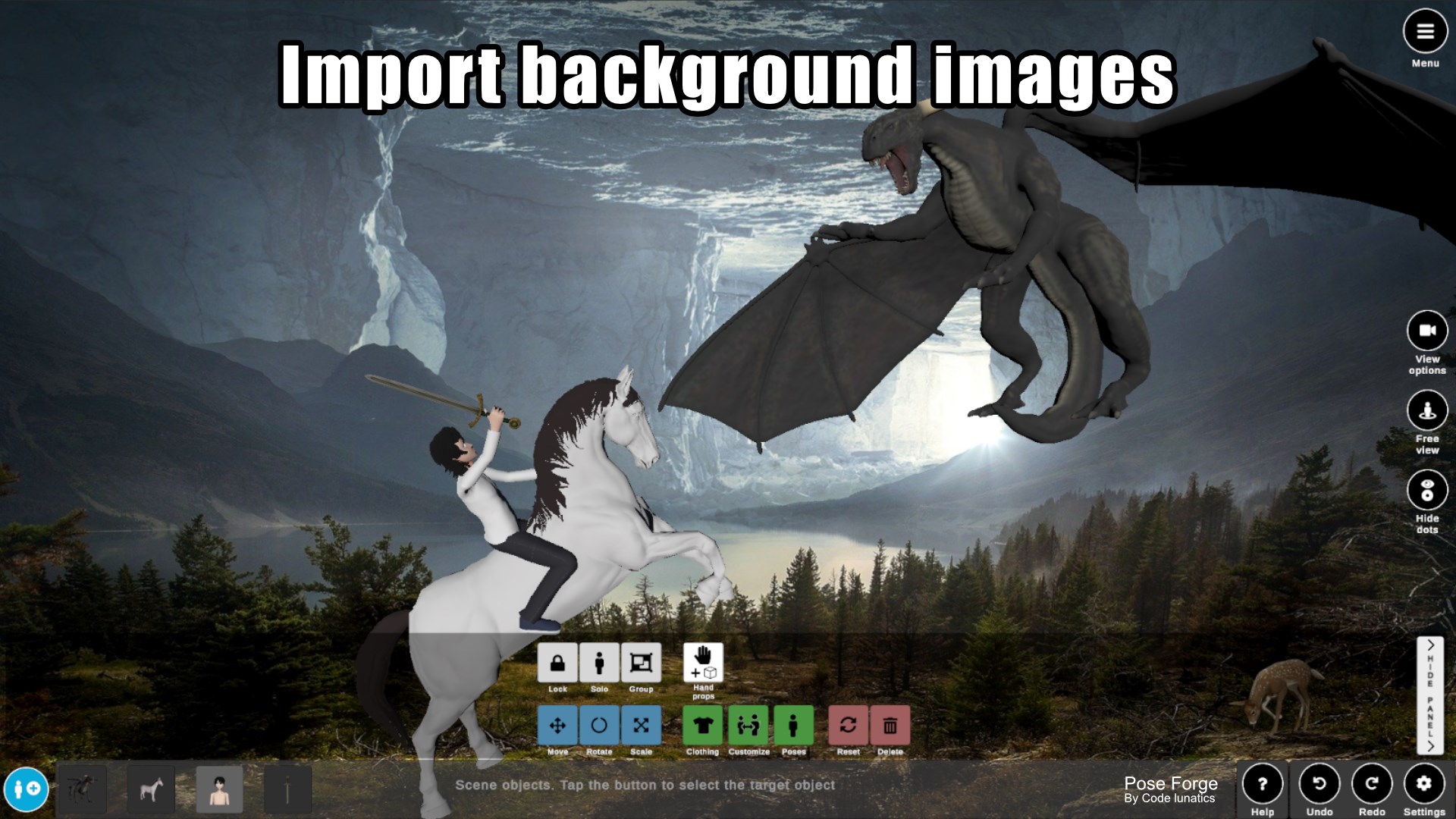 Boost your creativity! Import background images to really bring your scene to alive! Choose background image from your computer, set it scale and rotation and you are good to go.