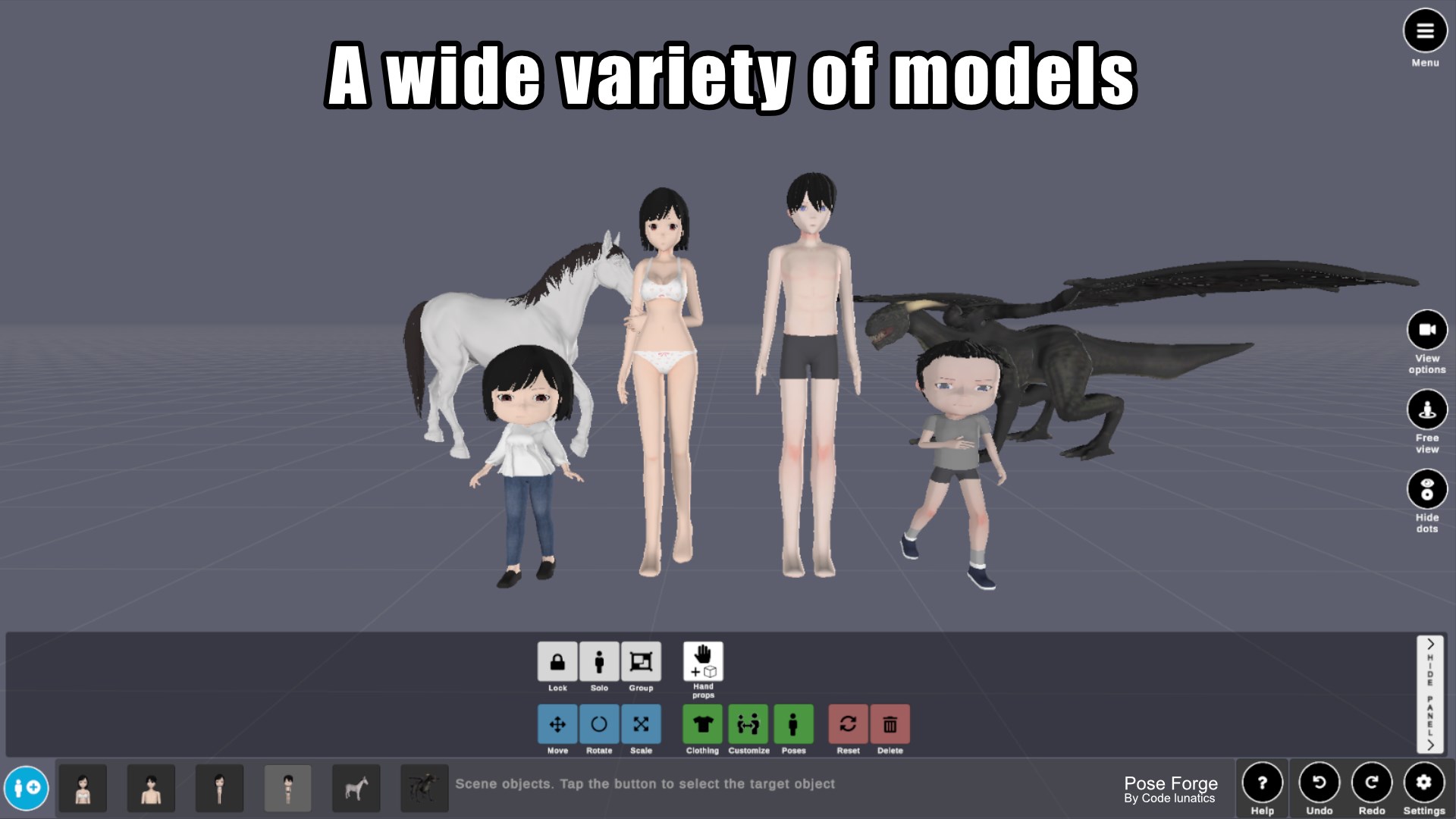 Male and female manga characters with different head to body ratioPosable horse and dragon modelsPose unlimited models and props in one sceneOver 100 premaid posesImport background imagesCustomize characters facesToon and 3D shadingExport your finished work as png to be used in other apps