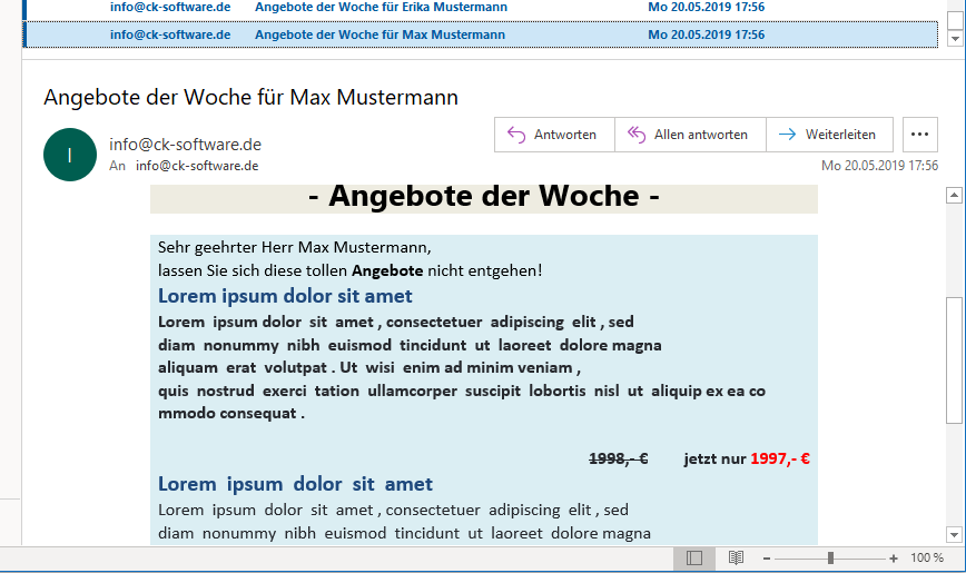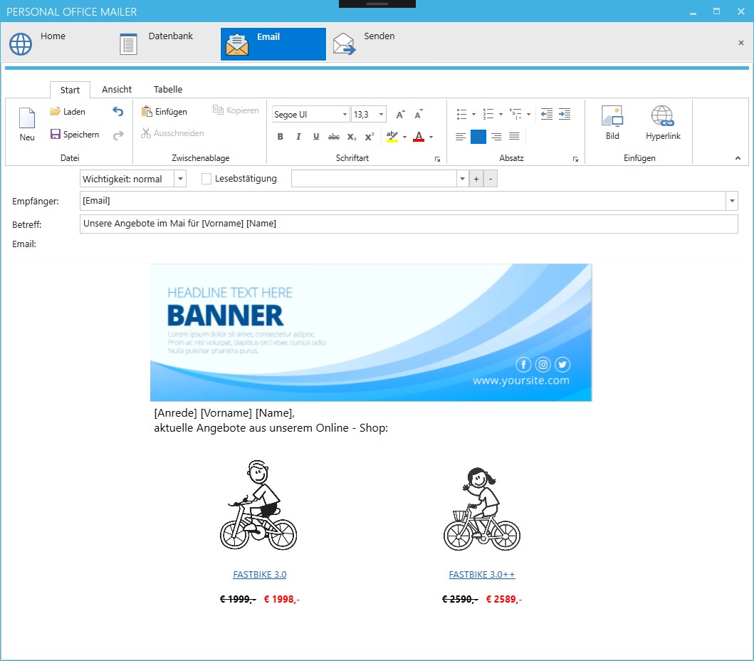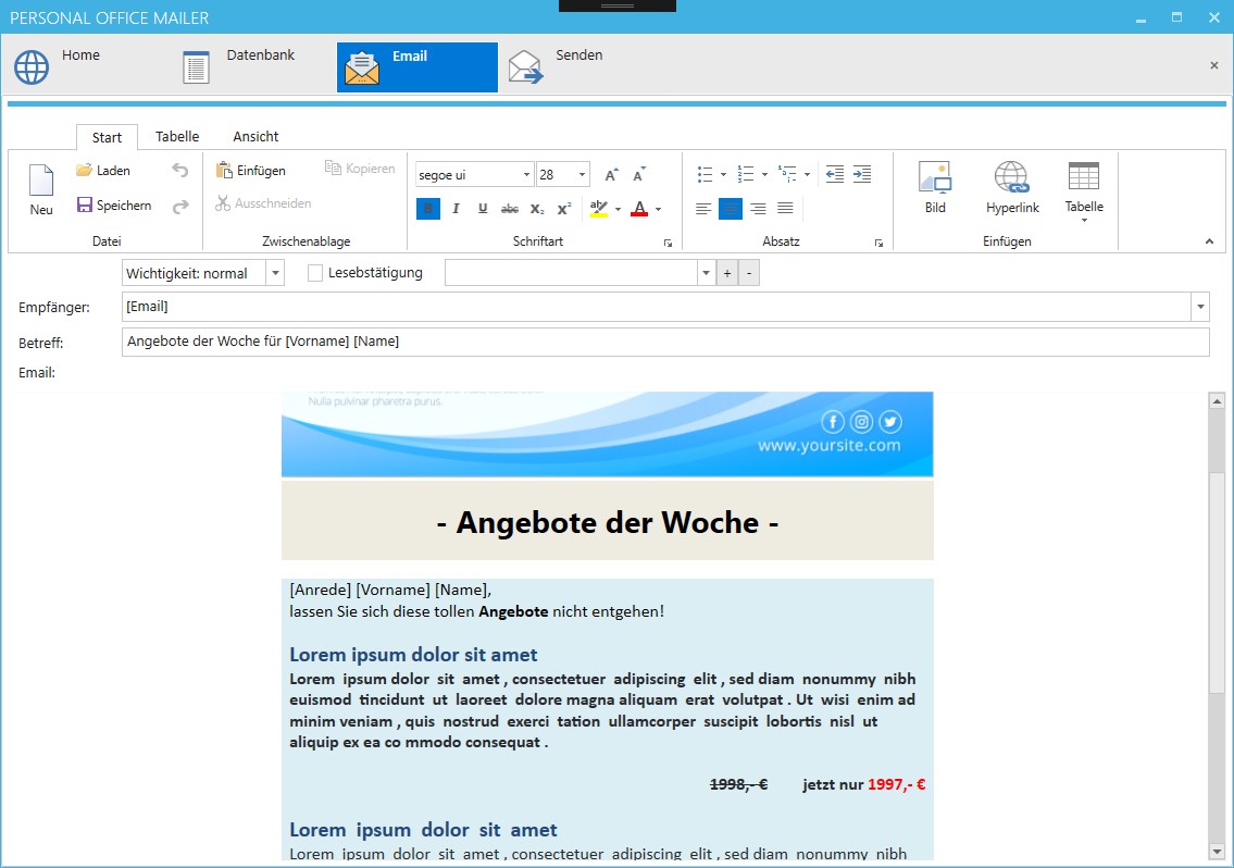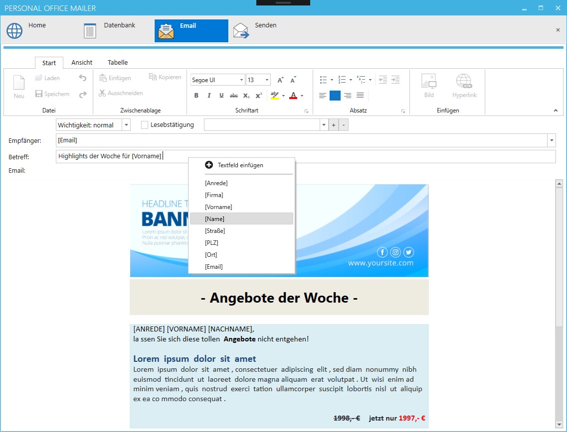 Then create your email in a Microsoft Word like editor. Anywhere text fields can be used, which are filled at the shipping for each recipient from your database.