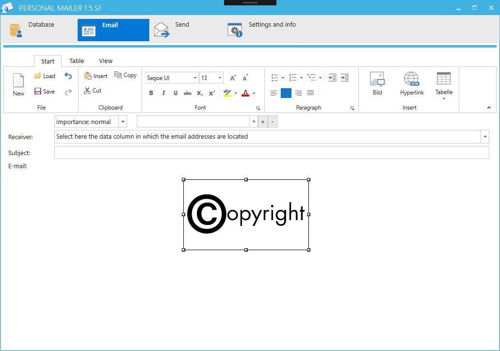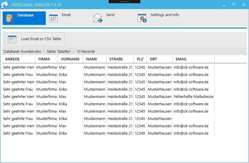 The handling of personal mailer is very easy. First select a database from which the program can determine email addresses and fill text fields. Currently the software processes all Microsoft Excel formats and CSV files. Unlike all online solutions, all customer data remains DSGVO compliant and secure within your own systems.