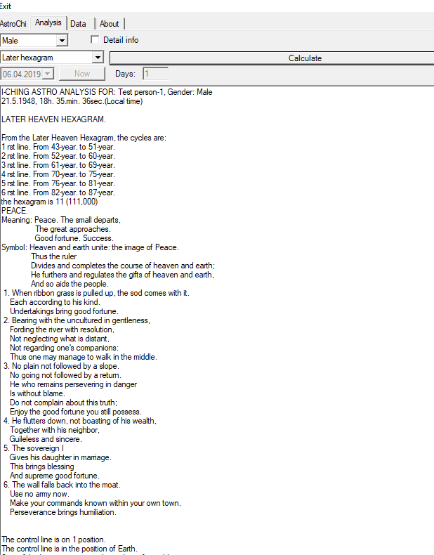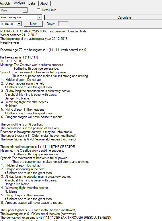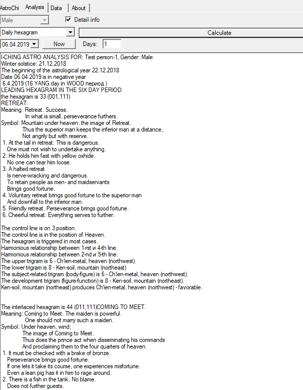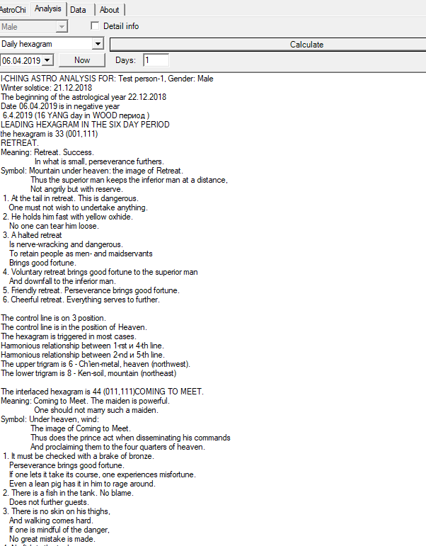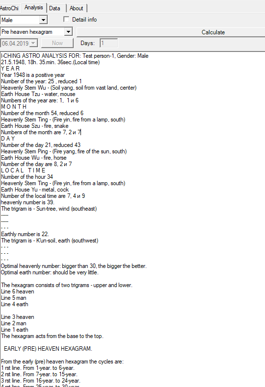 Pre-Heaven Bagua, Later-Heaven Bagua, Yearly and Daily Hexagrams Analysis. Hexagram description, prognostic. Trigram interactions, analysis.