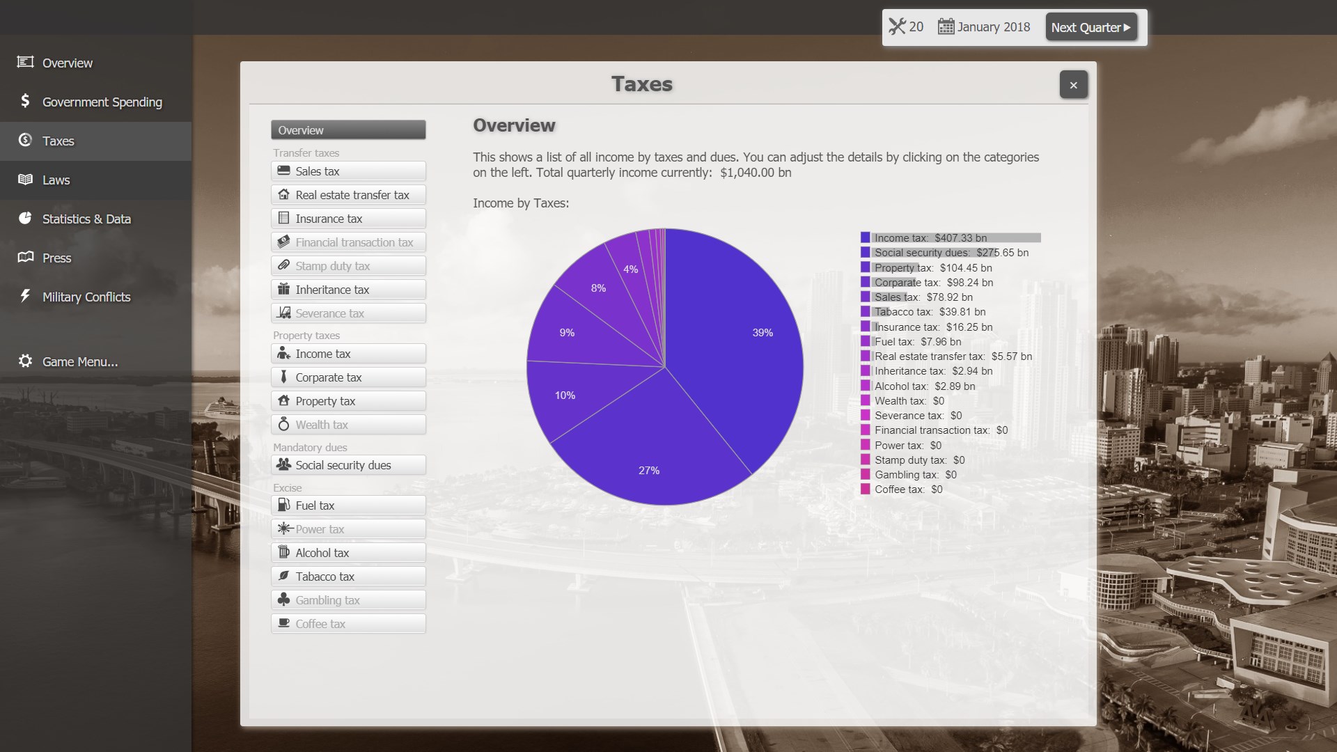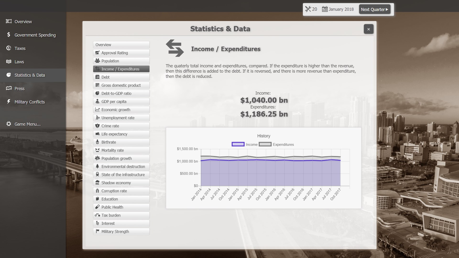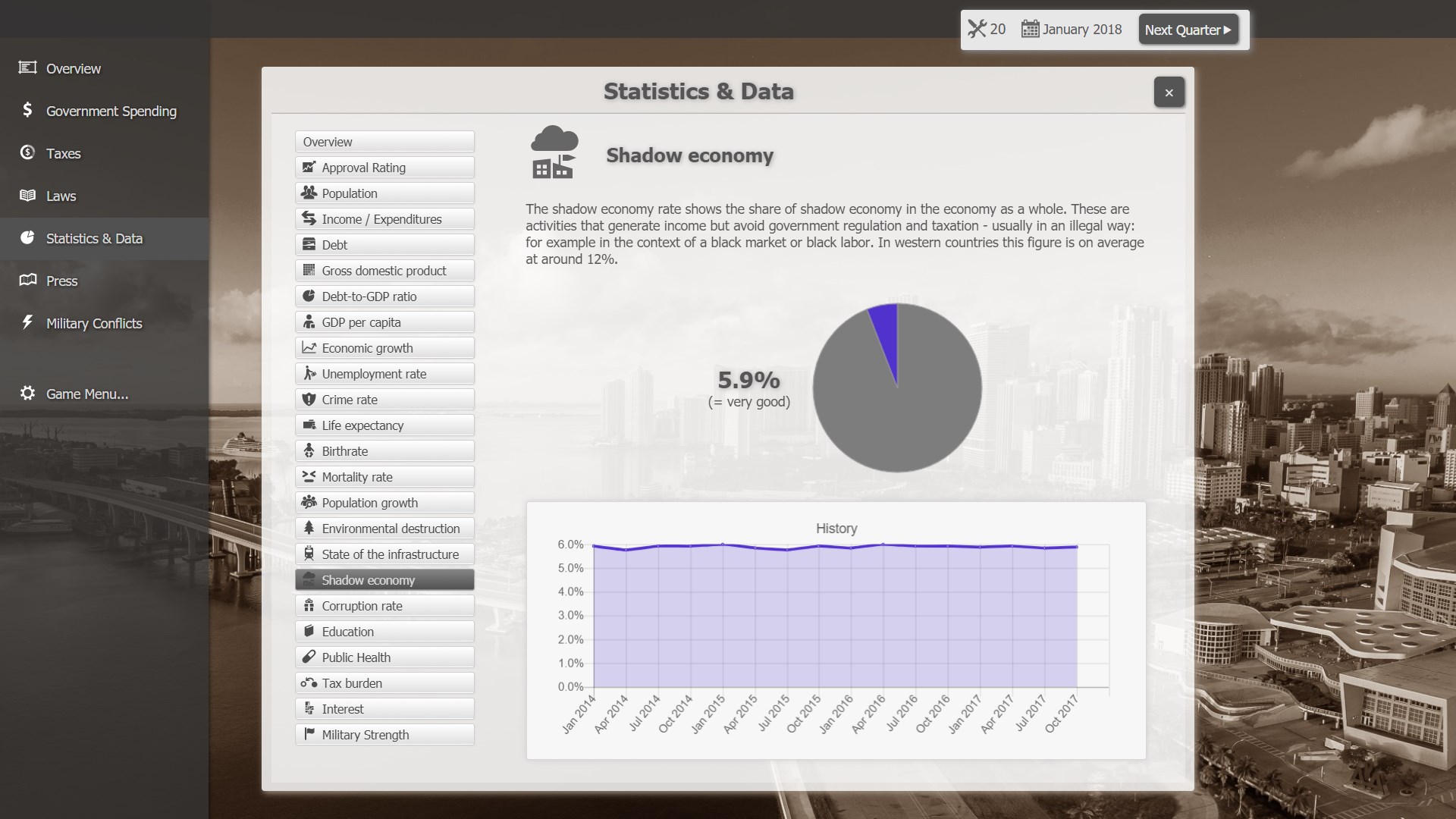 The game simulates a whole country: Population, debt, GDP, economic growth, unemployment, crime, life expectancy, birth rate, mortality rate, state of the infrastructure and so on. The player can adjust budgets, taxes, laws, and see what the outcome is.