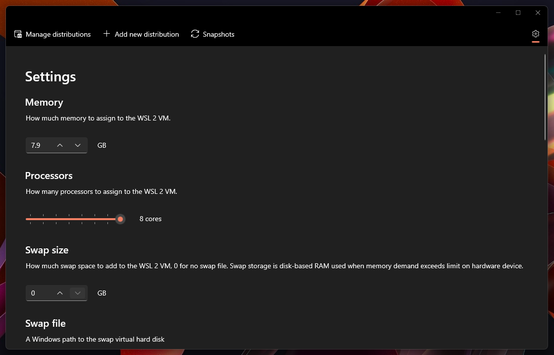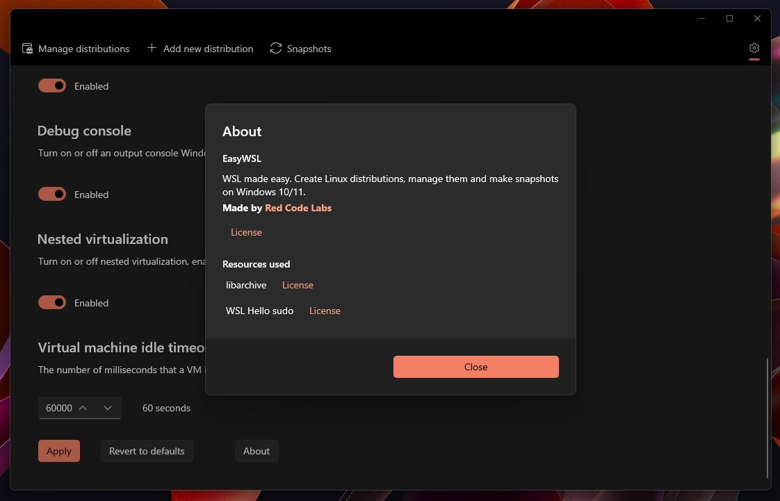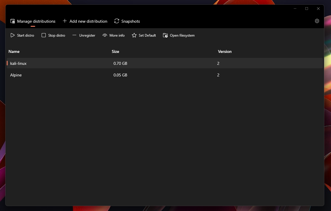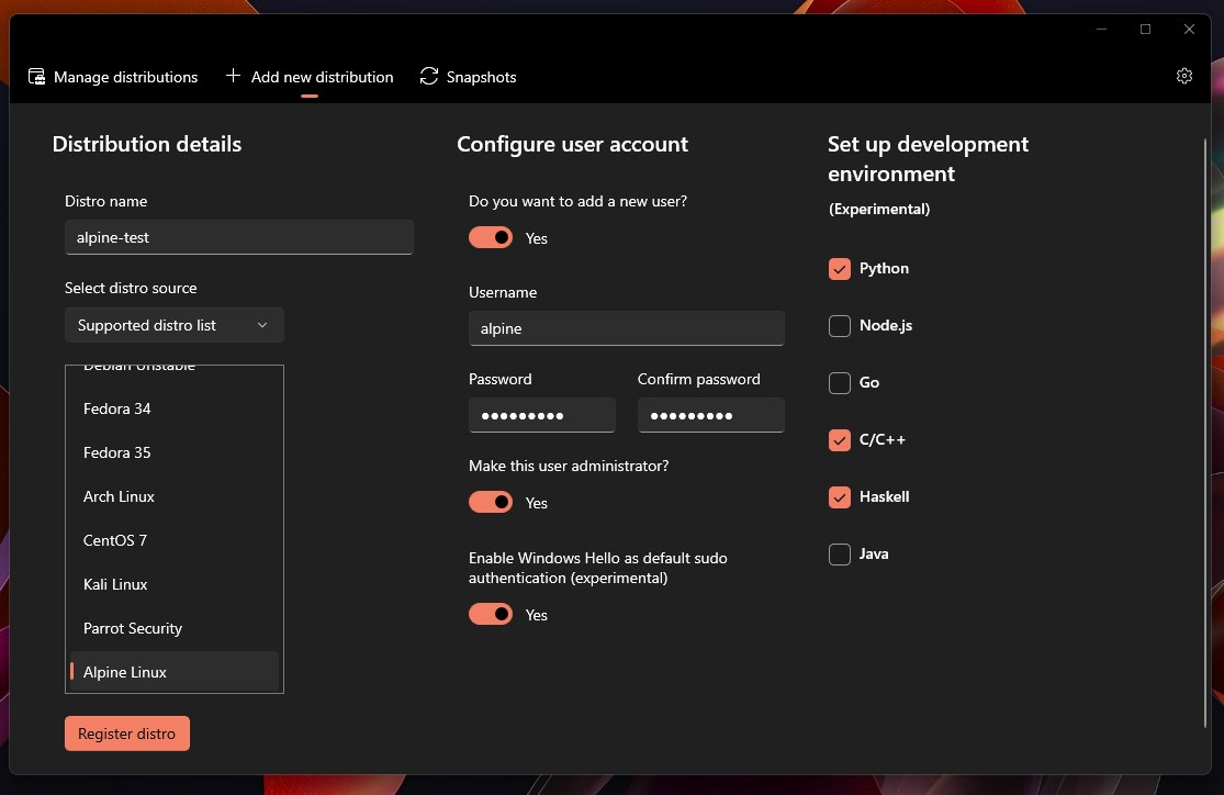 manage distrosopen distro filesystemcreate and register snapshotsconfigure distro at the time of the installationmanage your WSL settings in general(experimental) WSL-Hello-sudo integration(experimental) set up development environments at the time of the installation