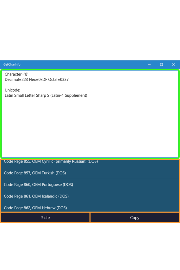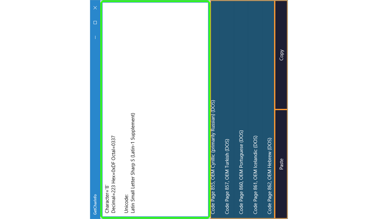 The application supports the entire Unicode range (in practice: without Space), and over 60 Code Pages.