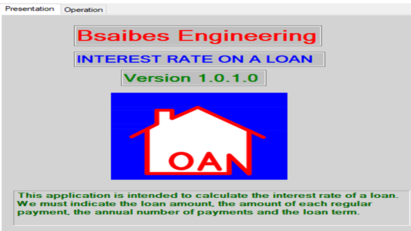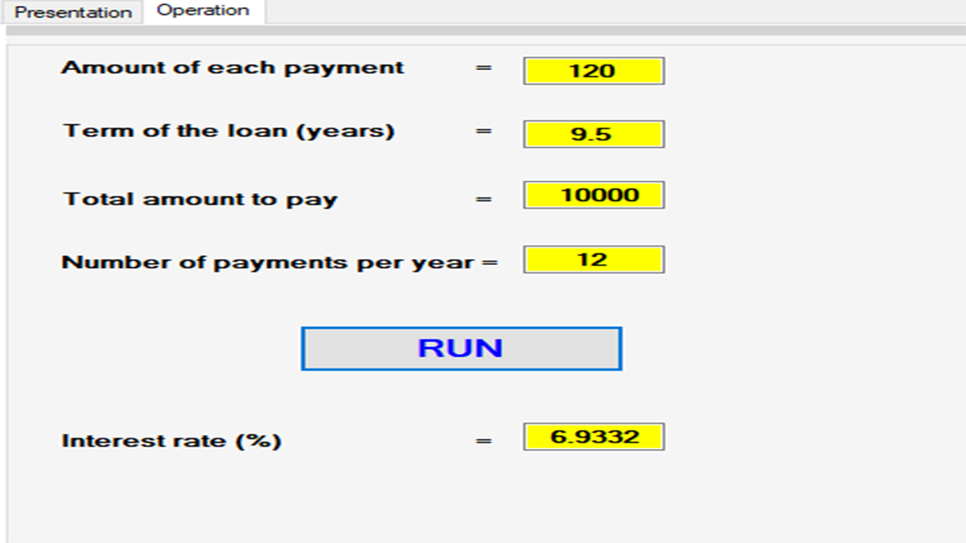 This application is intended to calculate the interest rate of a loan. We must indicate the loan amount, the amount of each regular payment, the annual number of payments and the loan term.