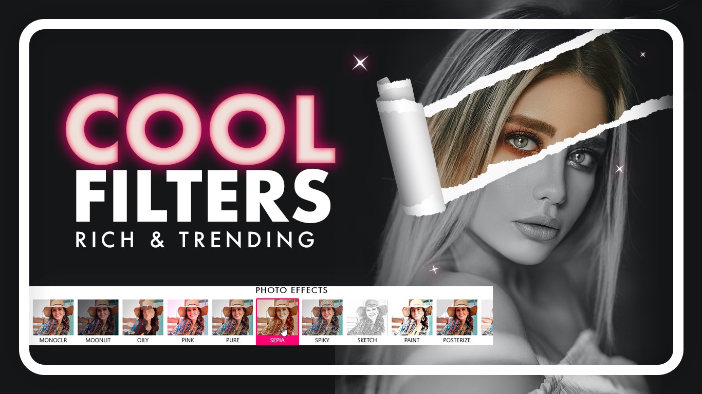 - **Filters:** Many filters for changing the look of photos, such as Cartoon, Emboss, Jazzi, and more.