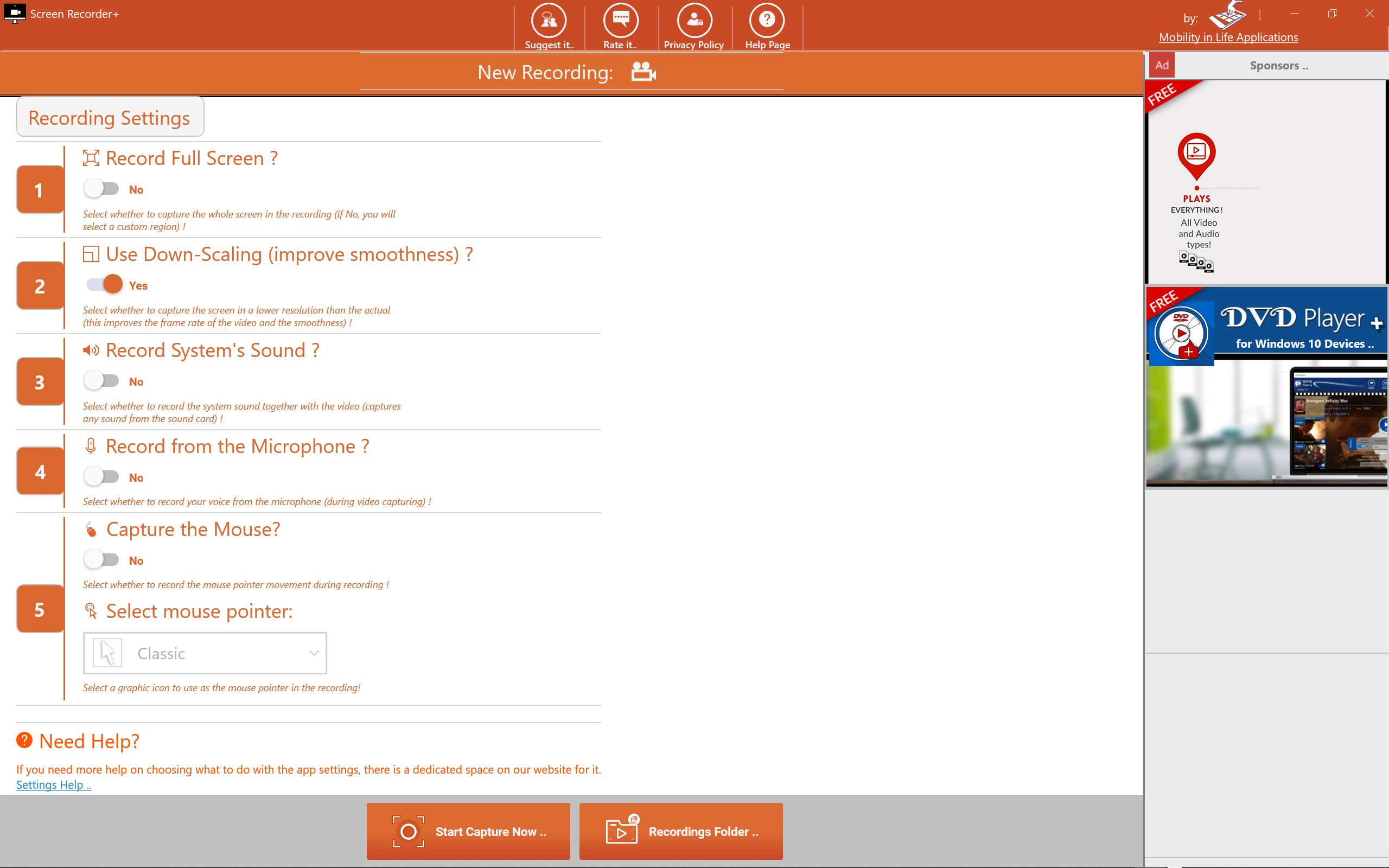 You are free to select if you want to record the system sound together, your voice, or the mouse pointer!