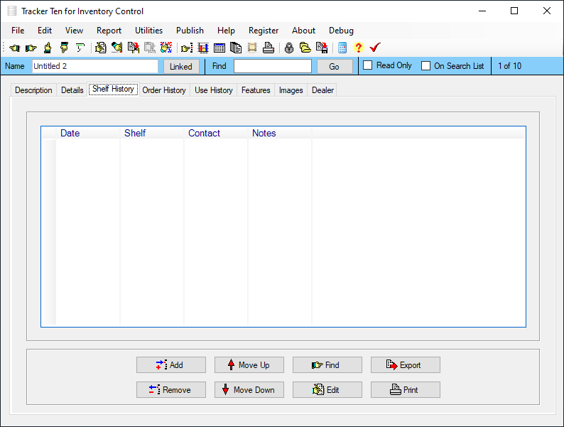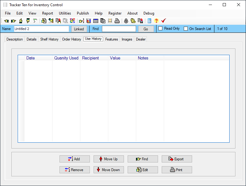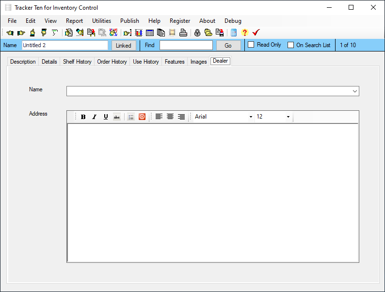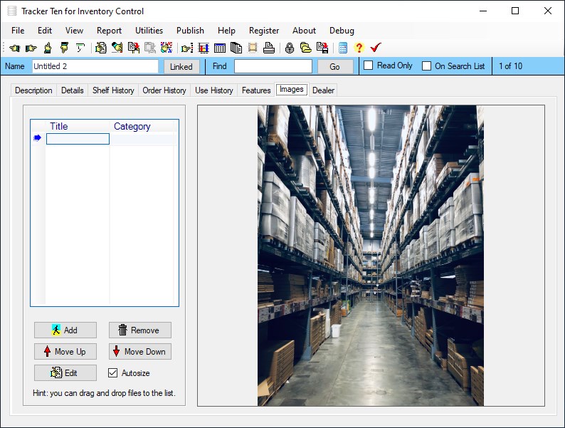 Tracker Ten for Inventory Control is designed to keep track of incoming and outgoing inventory for stock rooms, warehouses, stores and more. The software features inventory quantity tracking, barcode generation and printing (to all standard barcode printers), rich text edit areas, shelf movement tracking, flexible full color reporting and graphing, re-order reporting, multi-image tracking for each record and much more! The software includes numerous customizable fields, so it can be easily setup for almost any type of inventory tracking application.
