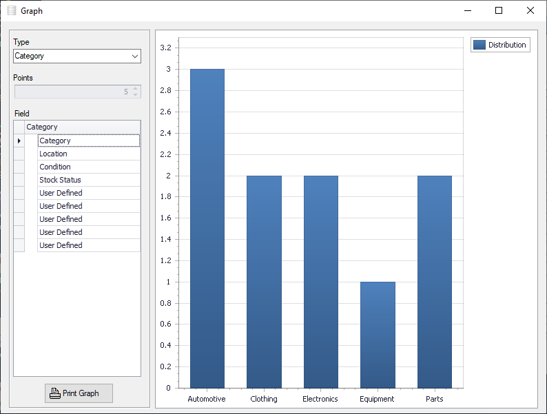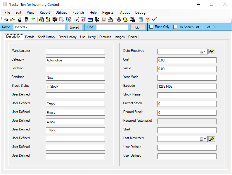 Sample fields include manufacturer, category, location, condition, stock status, date received, cost, value, year made, barcode, stock name, current stock, desired stock, required (automatic), shelf.Numerous user defined fields so you can setup the software to suit your exact needs.Online help file.Very easy to learn and use.Rich text format notes areas for customer details and notes.30 Customizable feature tracking check boxes.Dealer name and contact information tracking area.Advanced multi-level nested item categorization system.Quick and Easy Data Entry with Customizable Pull Down Menus.Powerful Data Sorting and Filtering.Simple and easy cut, copy, insert and record navigation functions.Multiple Image Support (up to 100 pictures for each record !). All major image types are supported (i.e. bmp, jpg, gif, png etc.). Easily incorporate pictures from your Digital Camera or Scanner. Also attach and view PDF equipment manual files in Image area.Full color image reports.Powerful and Intuitive Search Functions that let you quickly and easily retrieve the data you need Comma delimited data import.Multiple Data Views Including Spreadsheet, Album View (allowing you to visually view different items in your inventory side by side) and 3-dimensional full color Graphs showing inventory breakdown.Data export features allowing you to transfer data to spreadsheets or other software programs.Works for other, automotive, clothing, electronics, equipment, parts, supplies, cleaning, office and more!