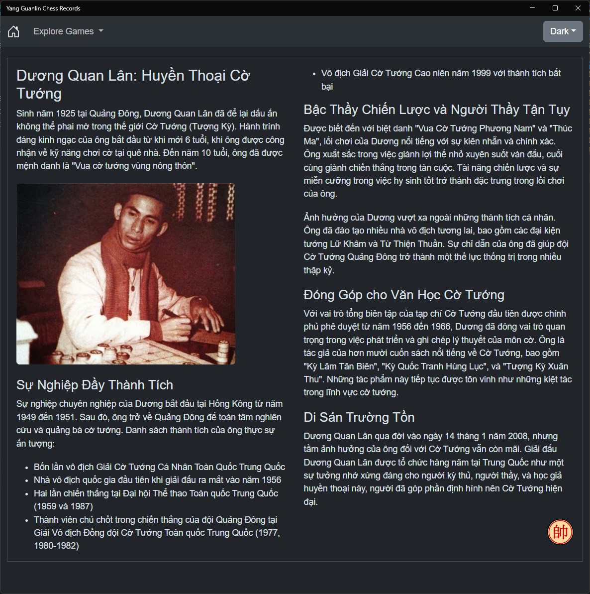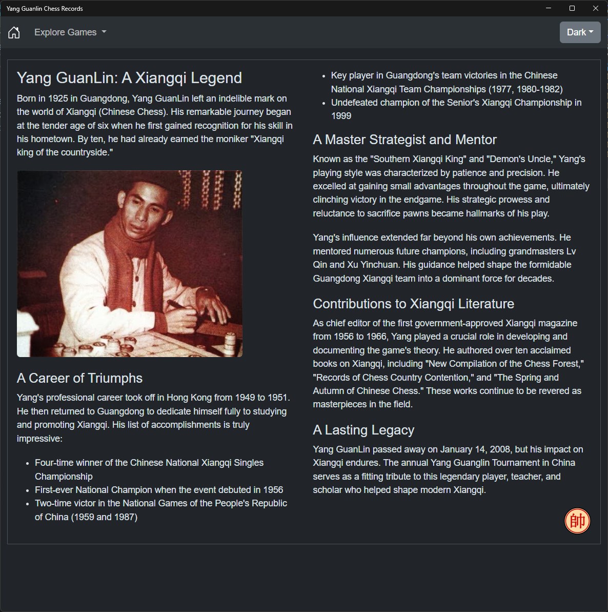 Yang's professional career took off in Hong Kong from 1949 to 1951. He then returned to Guangdong to dedicate himself fully to studying and promoting Xiangqi. His list of accomplishments is truly impressive: