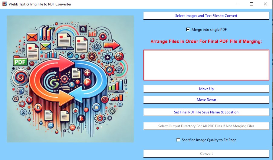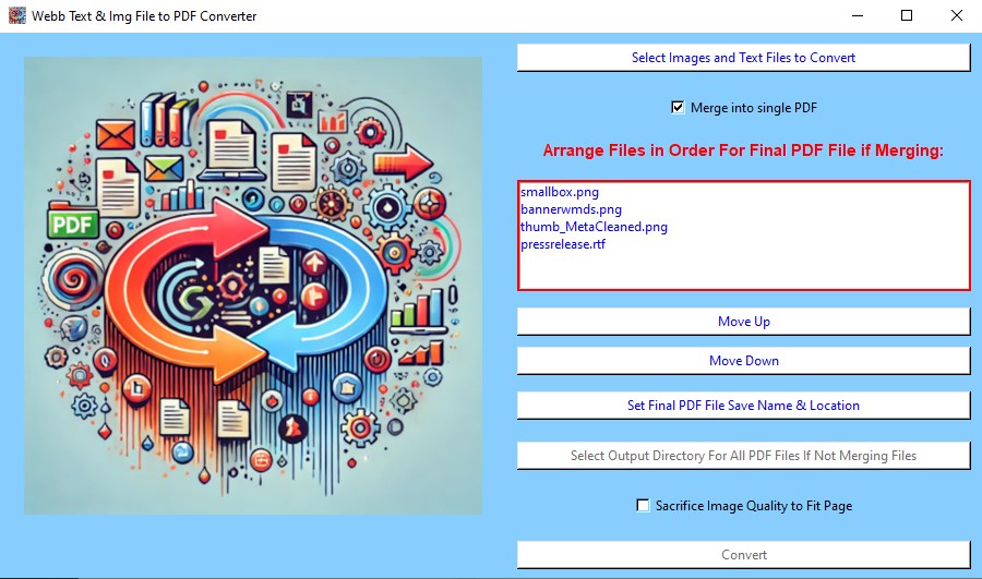 Convert text or image files into PDF filesConvert multiple files at one time for easy conversion of large numbers of files at onceCombine the text and image files into a single pdf or multiple filesIf you save the text and image files as a single pdf you can sort the order of the files so your final PDF is in the right order
