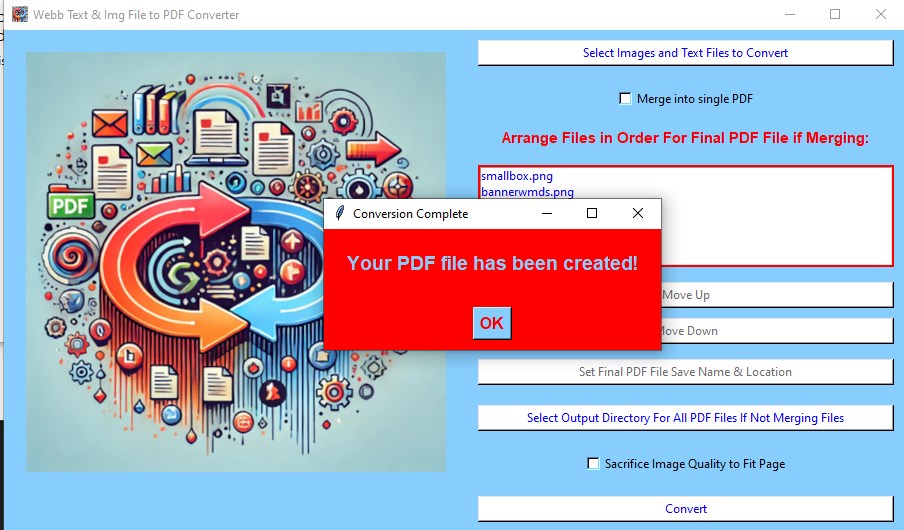 This application converts text and image files into multiple or a single pdf file. The user can choose to either maintain each file as an individual file (for easy bulk conversions) or it will combine data from multiple text and image files into a single pdf.