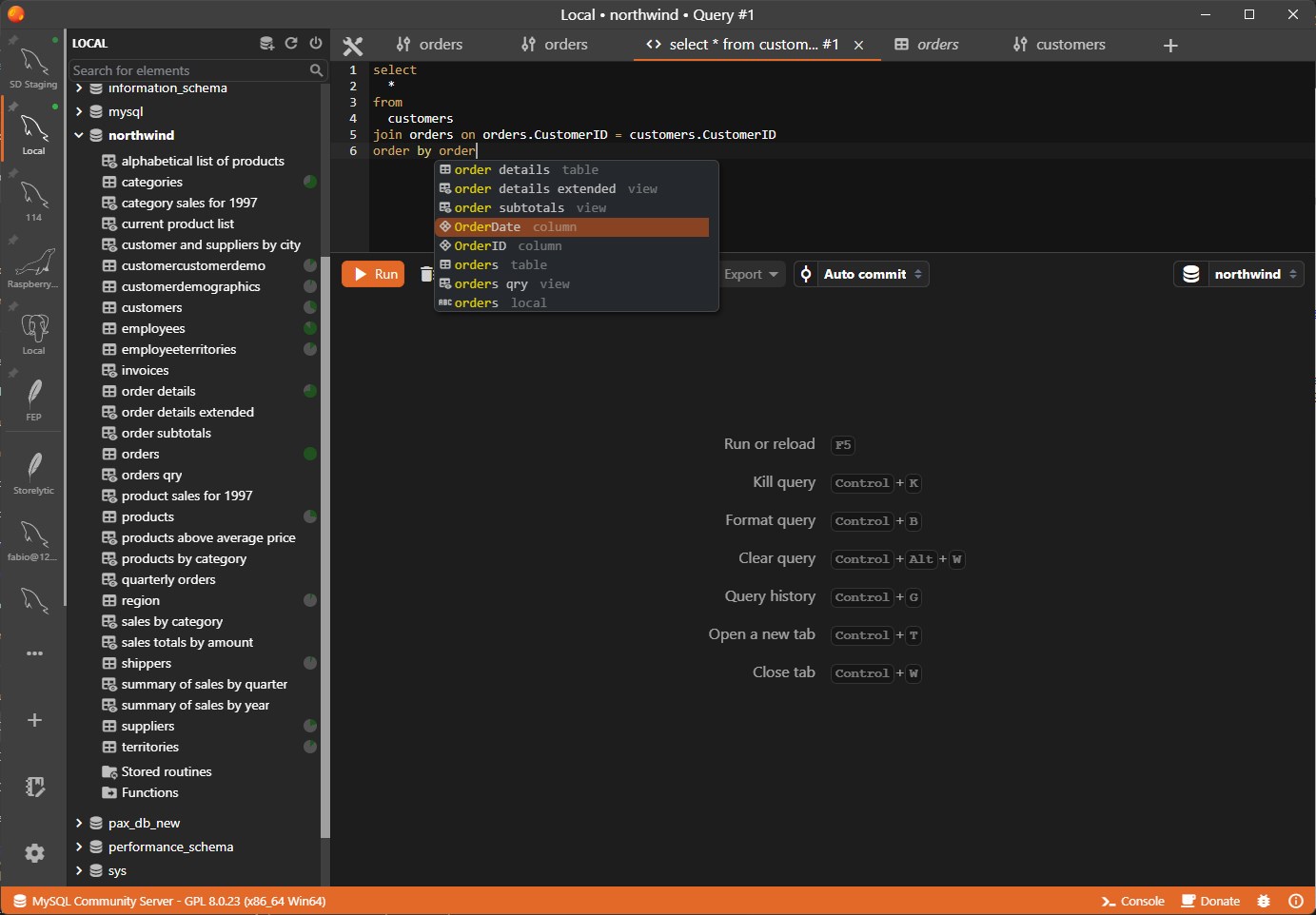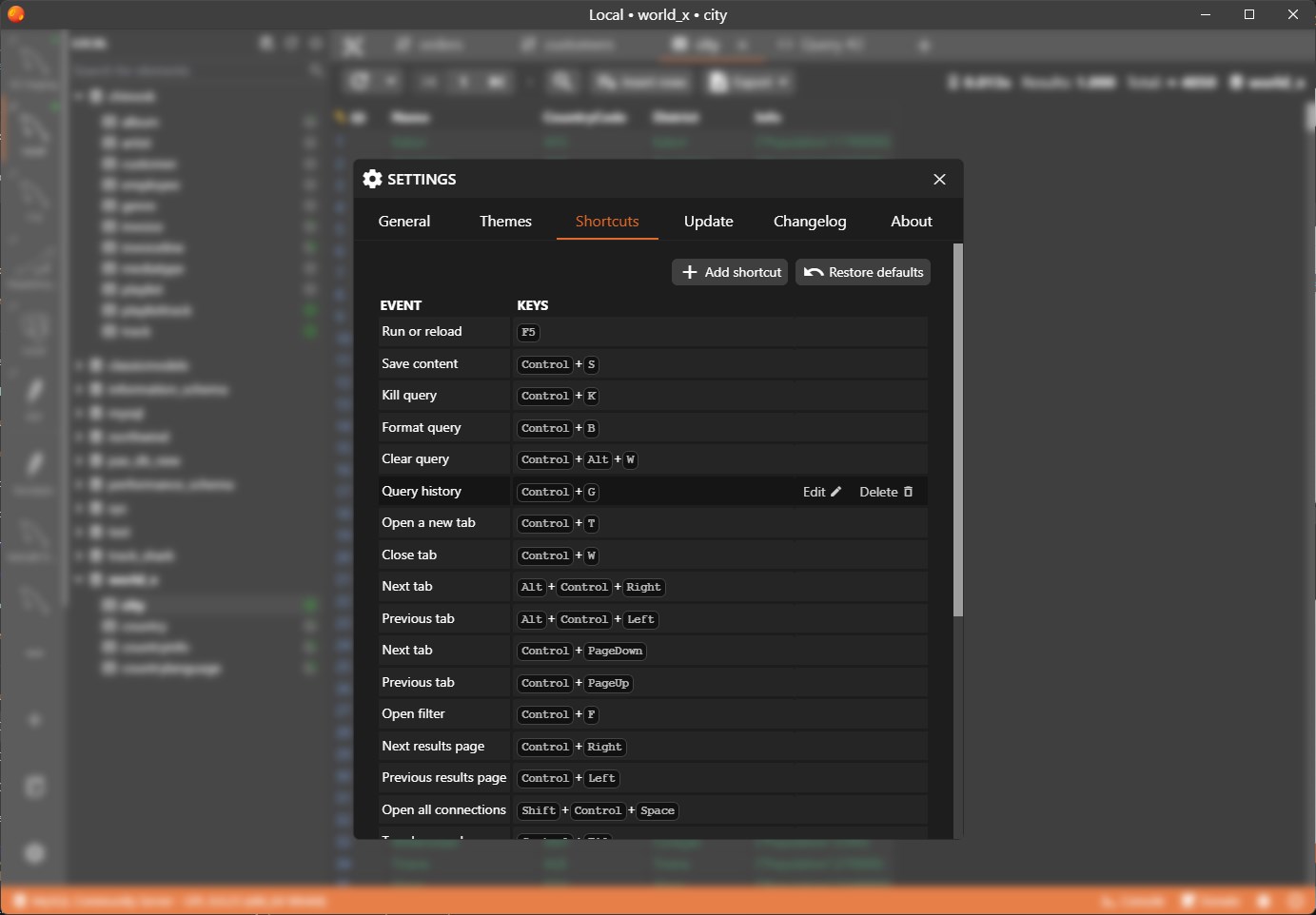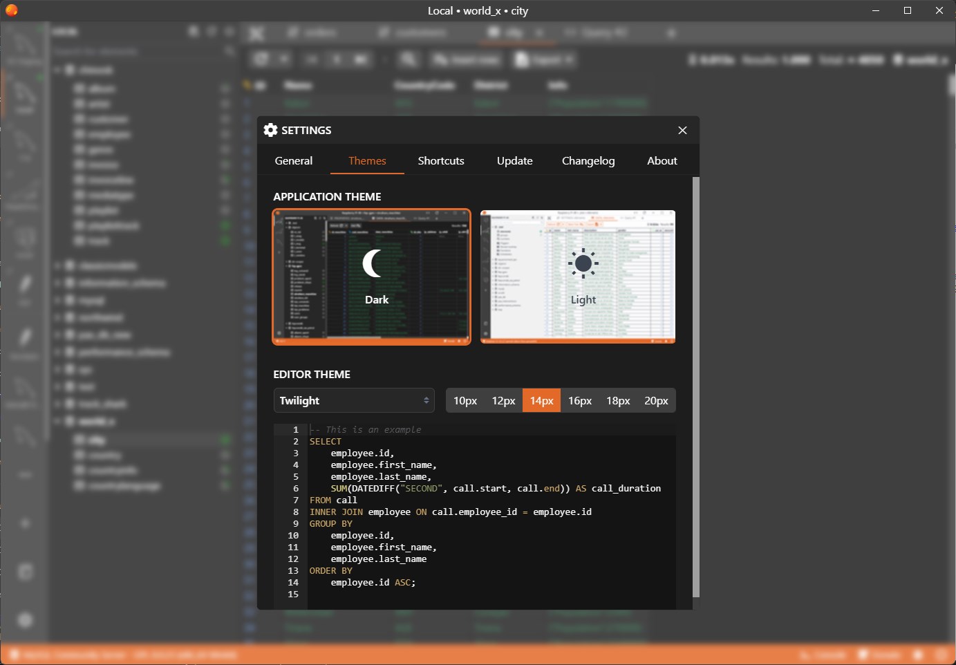 Multiple database connections at same timeDatabase management (add/edit/delete)Full tables management, including indexes and foreign keysViews, triggers, stored routines, functions and schedulers management (add/edit/delete)Fake table data filler to generate tons of data for test purposeA modern and friendly tab system; keep open every kind of tab you need in your workspaceQuery suggestions and auto completeDark and light themeImport and export database dumpsSSH tunnel support