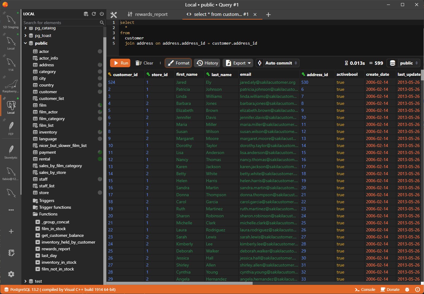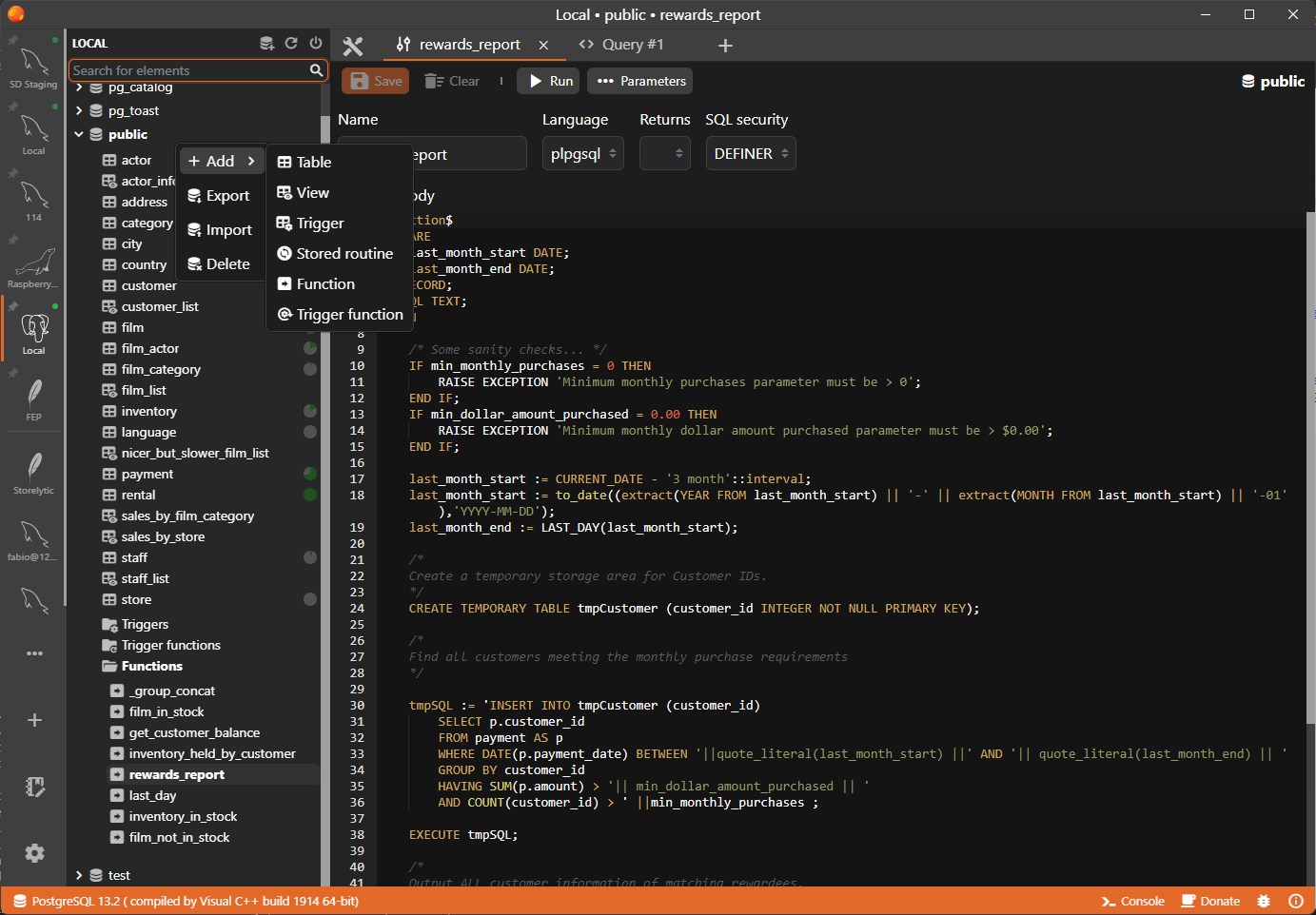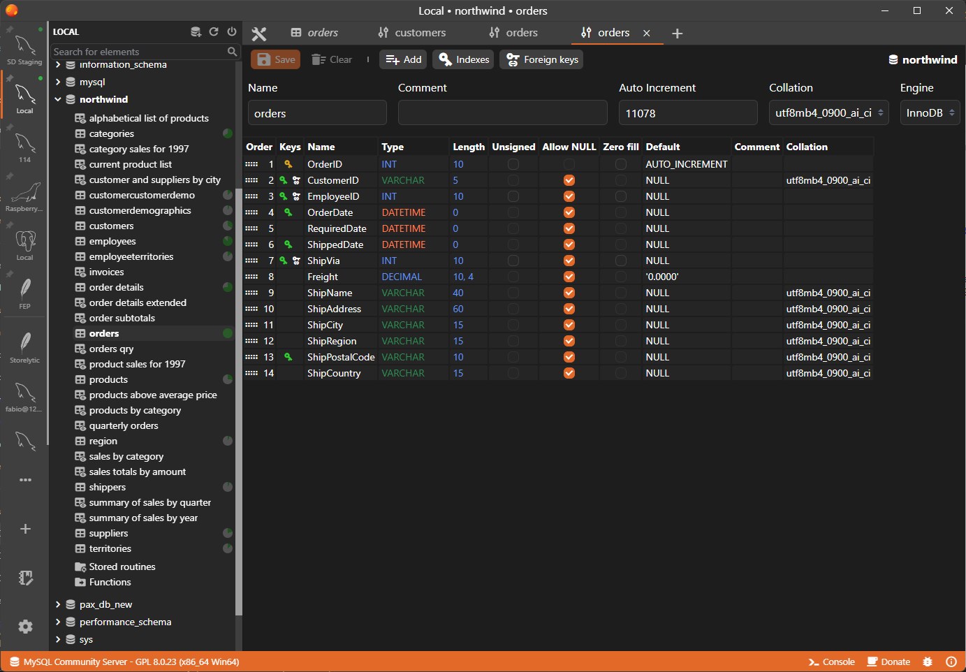 Multiple database connections at same timeDatabase management (add/edit/delete)Full tables management, including indexes and foreign keysViews, triggers, stored routines, functions and schedulers management (add/edit/delete)Fake table data filler to generate tons of data for test purposeA modern and friendly tab system; keep open every kind of tab you need in your workspaceQuery suggestions and auto completeDark and light themeImport and export database dumpsSSH tunnel support