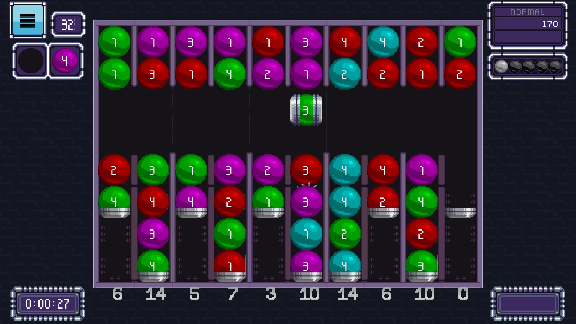 In this Game your goal is to place 3 marbles of the same color next to each other, by taking a marble from the top depot and letting them fall on the scales below. But beware, the more valuable a marble is the heavier it gets and putting too much weight on a scale can ti them over and send your marbles flying, causing mayhem whereever they land.