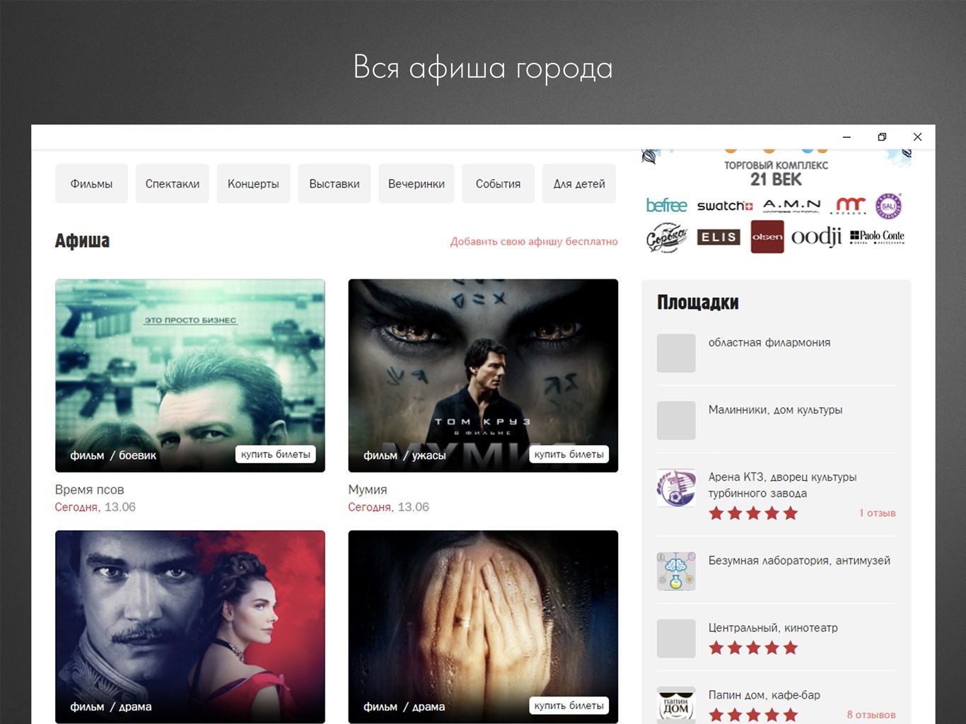 — Находите как провести свободное время: у нас есть расписания фильмов в кинотеатрах и выставок в музеях, время начала концертов и спектаклей, а также интересные вечеринки и детские мастер-классы в различных кафе и ресторанах нашего города