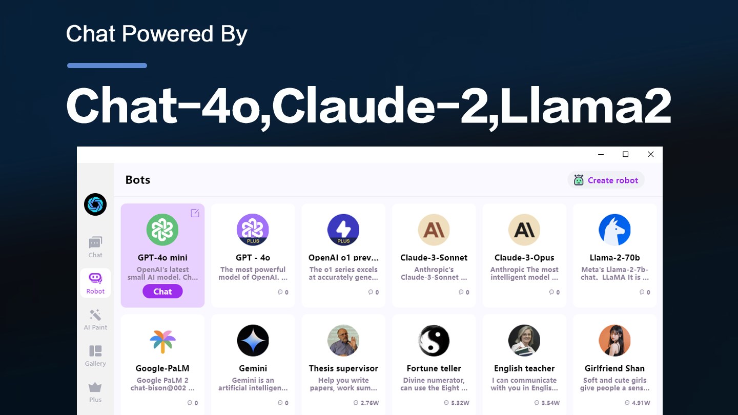 It integrates powerful AI models such as OpenAI's GPT-4 and OpenAI-o1, Anthropic's Claude 2, Meta's Llama, Google's PaLM, and more. Experience the forefront of AI technology in an application.