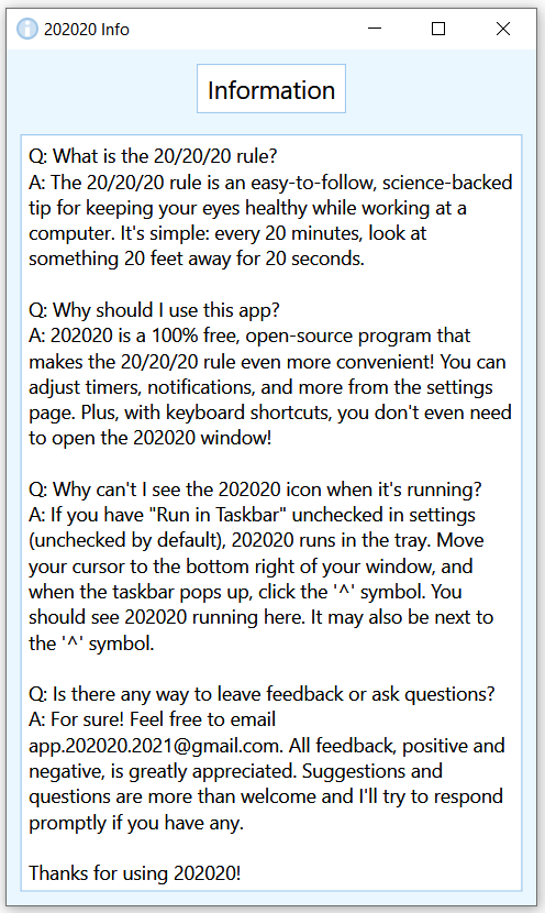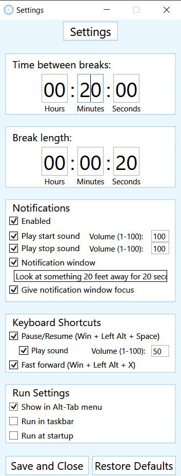 Keyboard shortcuts that can be enabled or disabledNotification sounds with adjustable volumeNotification window with adjustable text and adjustable focus that can be enabled or disabledExtremely low-profile: user can run app in system tray, hide it from alt-tab, or run it at startup if desiredFully adjustable timers"Restore Defaults" button in settings for a hassle-free optimal configurationClean UI with plenty of helpful tooltips100% free! No trial version, forced reviews, ads, or other junk- 202020 is purely made for you.