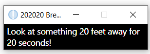 202020 is a simple and feature-rich app for following the 20/20/20 rule. It sets a 20 minute timer which triggers a notification window and 20 second break timer after it ends. After the break timer ends, the notification closes itself and the timer repeats. A short notification sound plays at the break timer's start and end.