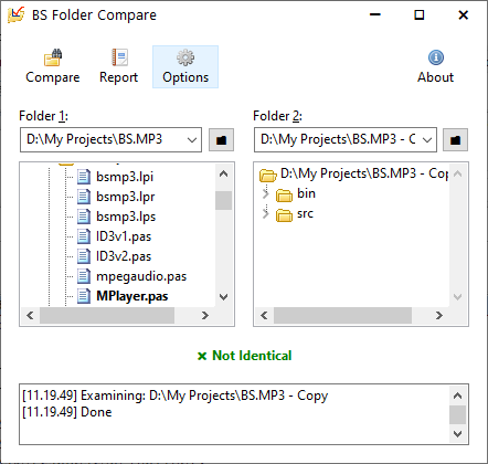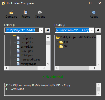 BS Folder Compare is a utility for comparing two folder structures with simple interface. Options for selective items are available. Hidden sub folders and files might also be ignore. It can generate a report as result.