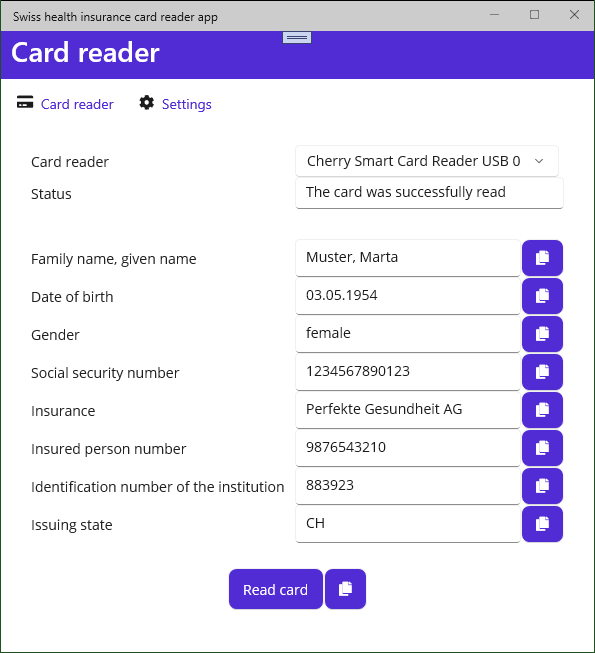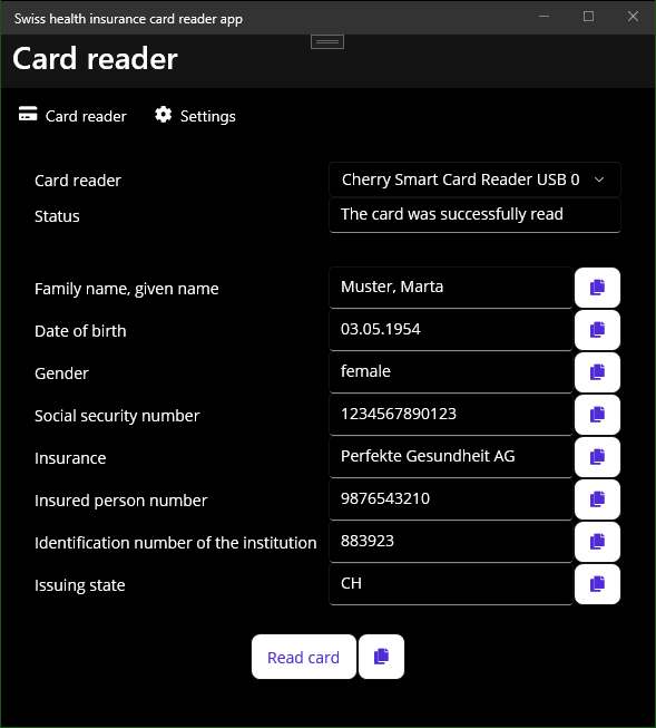 Reads the swiss health insurance smart card and displays its values.