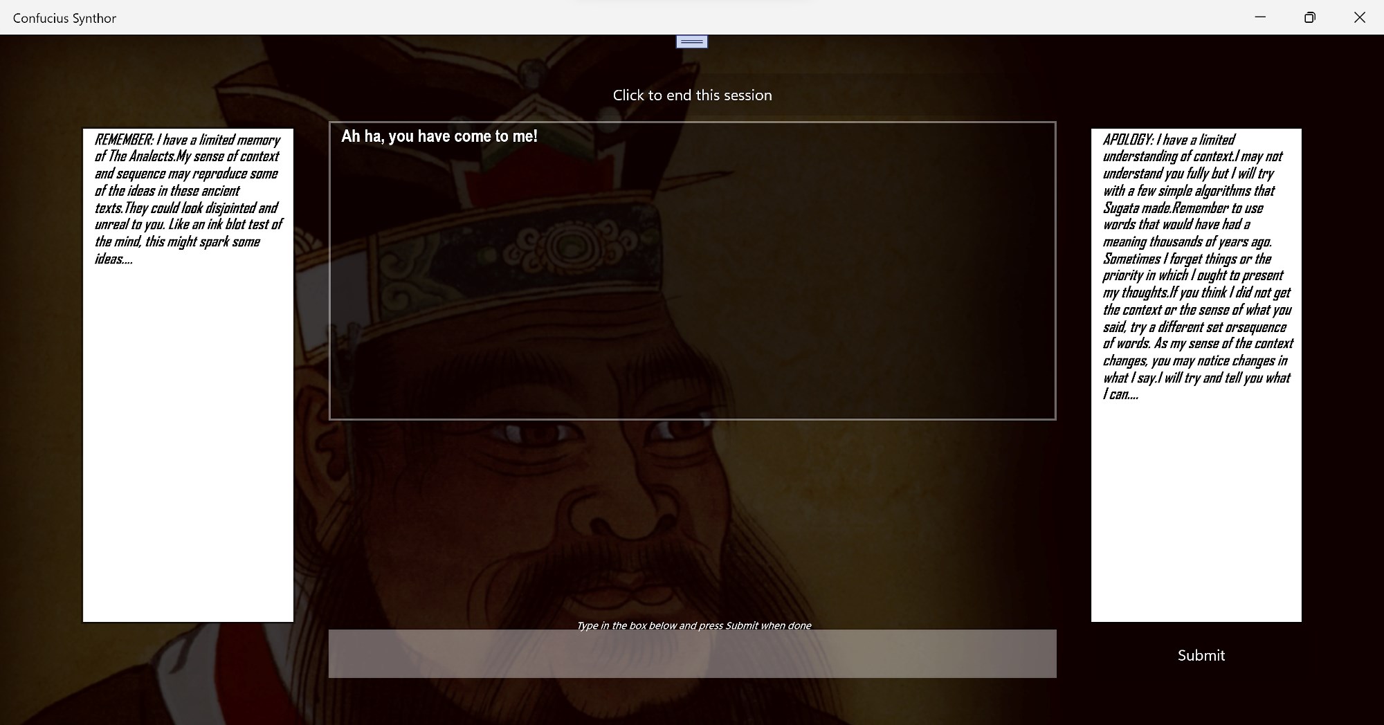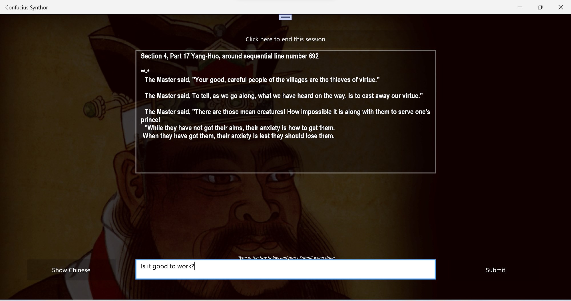 This is a Synthor made from The Analects of Confucius circa 500BCE. This was an amzing time for humanity when Confucius, The Buddha and Socrates were all creating the greatest thoughts of all time!