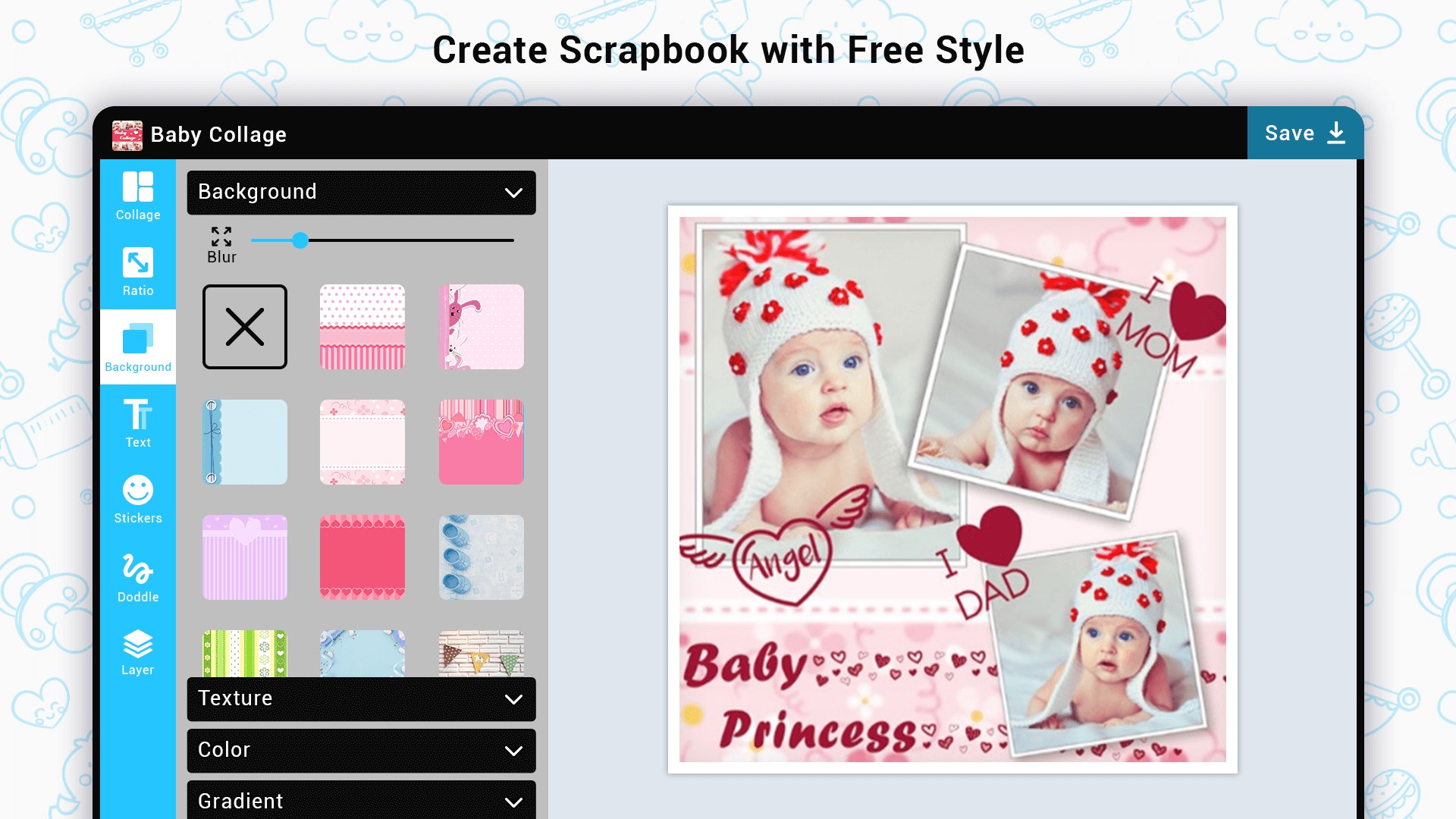 Baby Pics Baby Collage is a powerful collage photo editor for you to create amazing Baby Photo Collages using your photos, fun stickers, backgrounds, text with layout and texture.