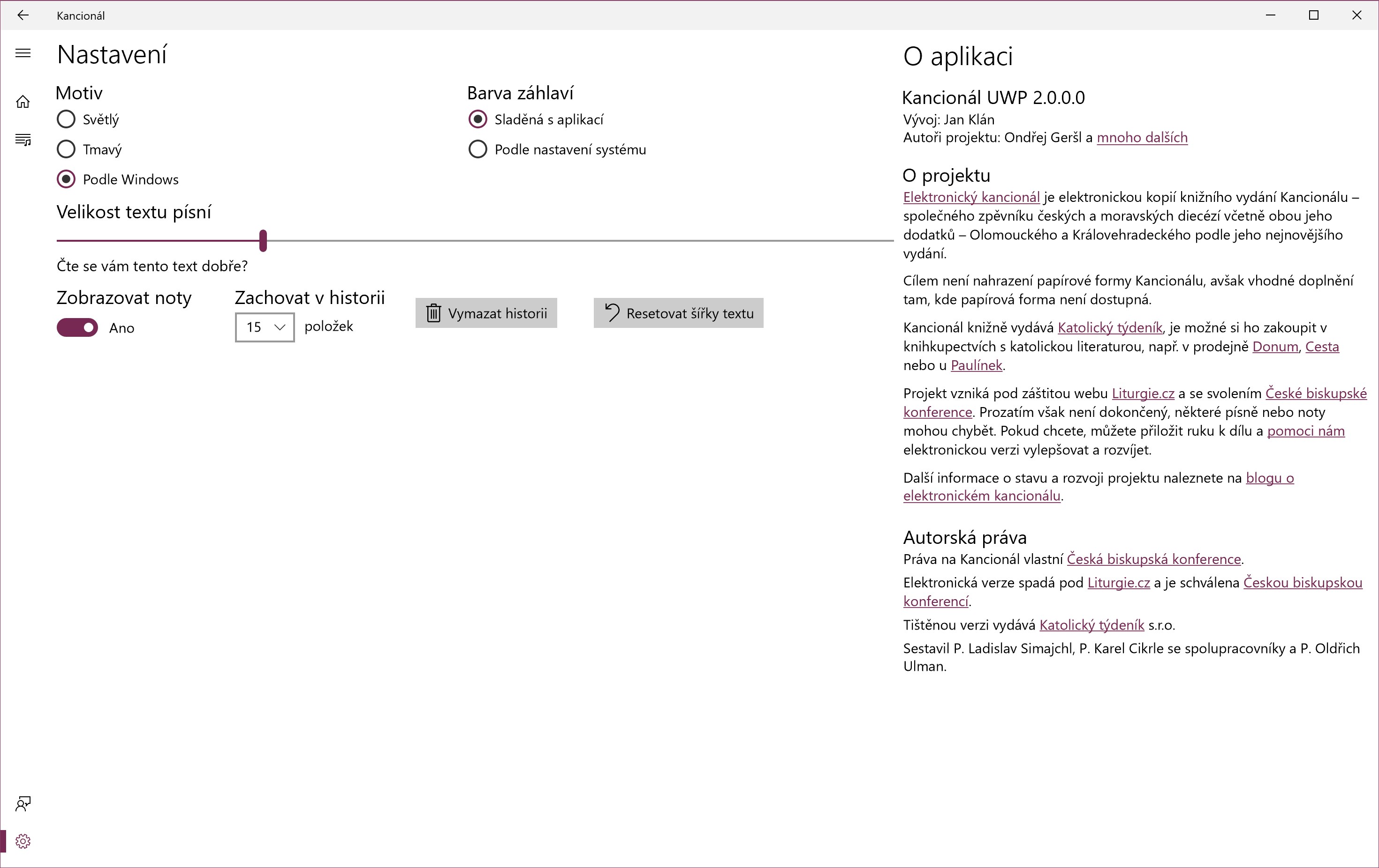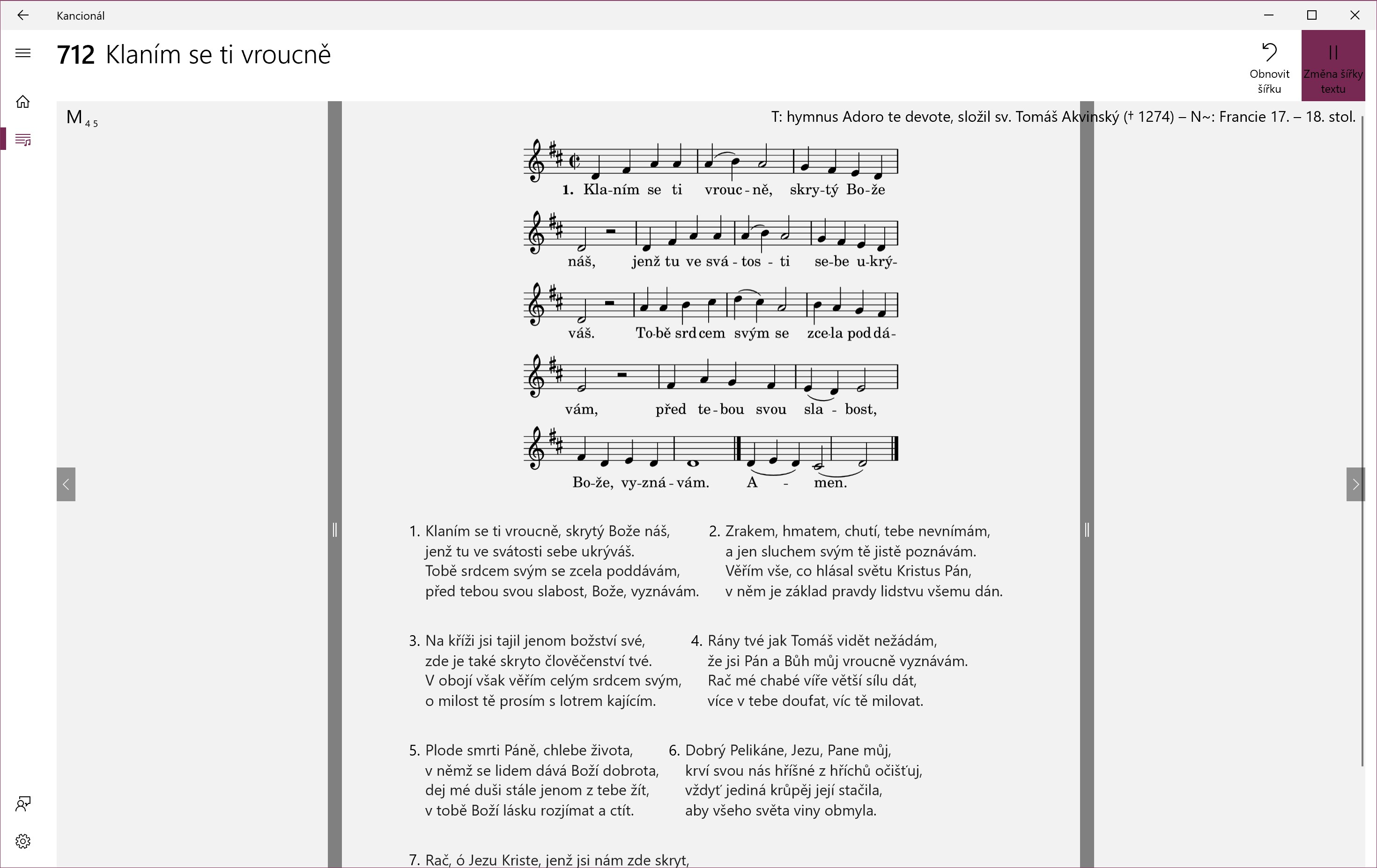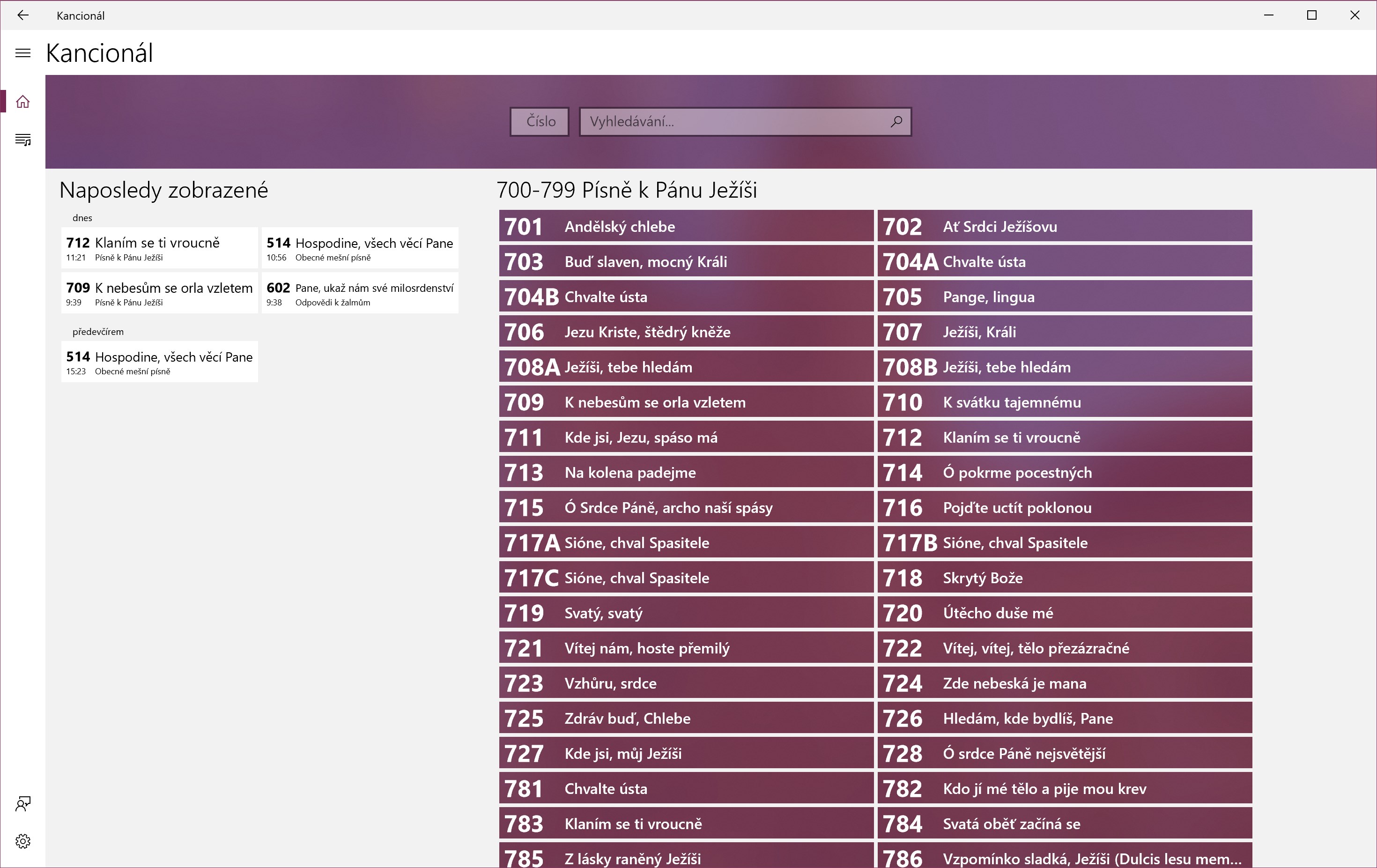 Tato univerzální aplikace pro Windows umožňuje offline přístup ke všem písním webové verze projektu elektronického kancionálu (Kancional.cz).