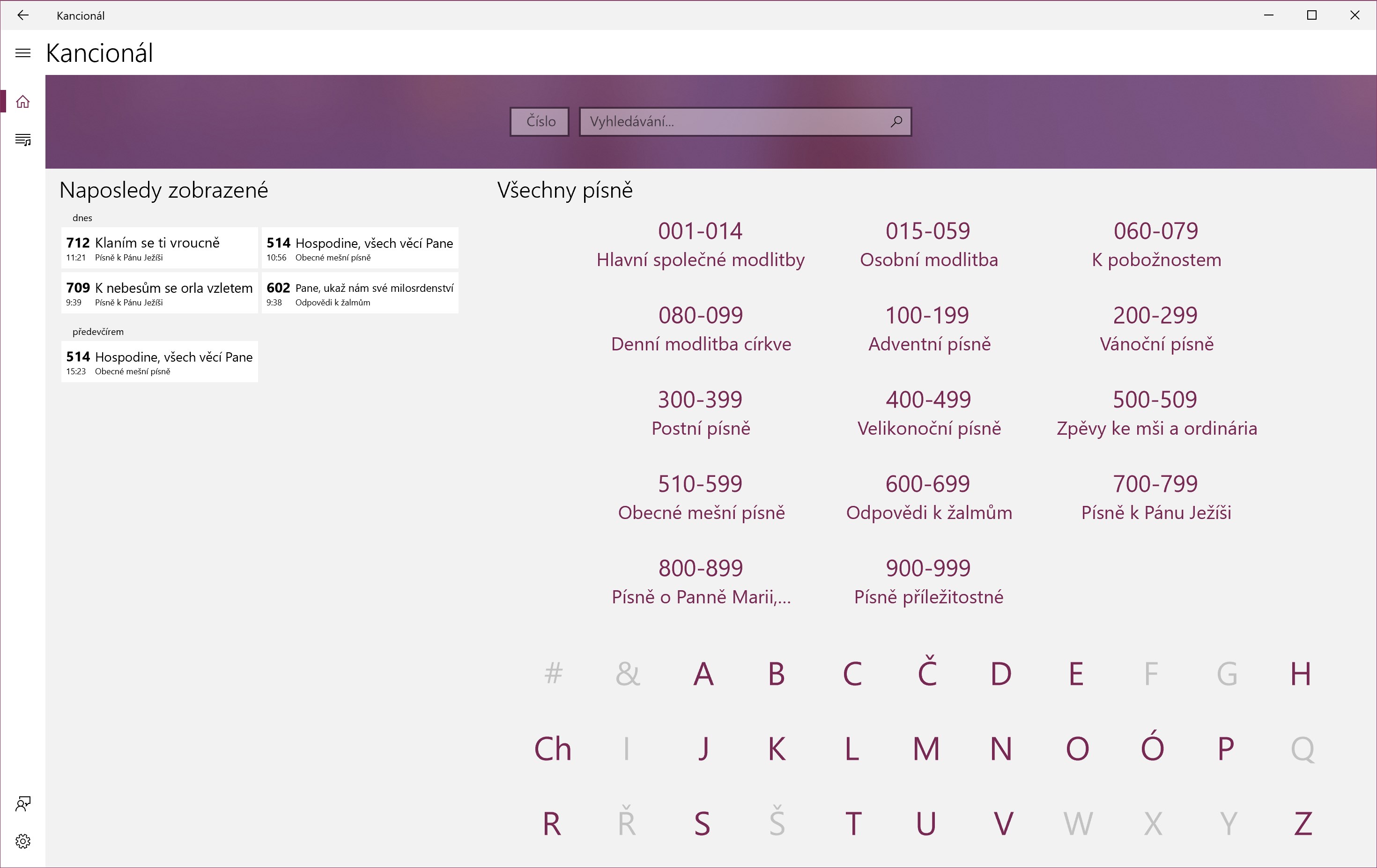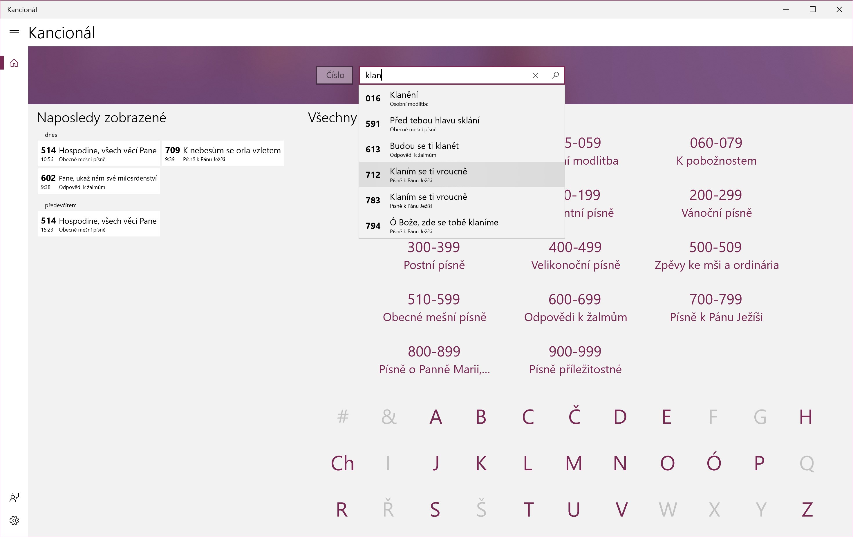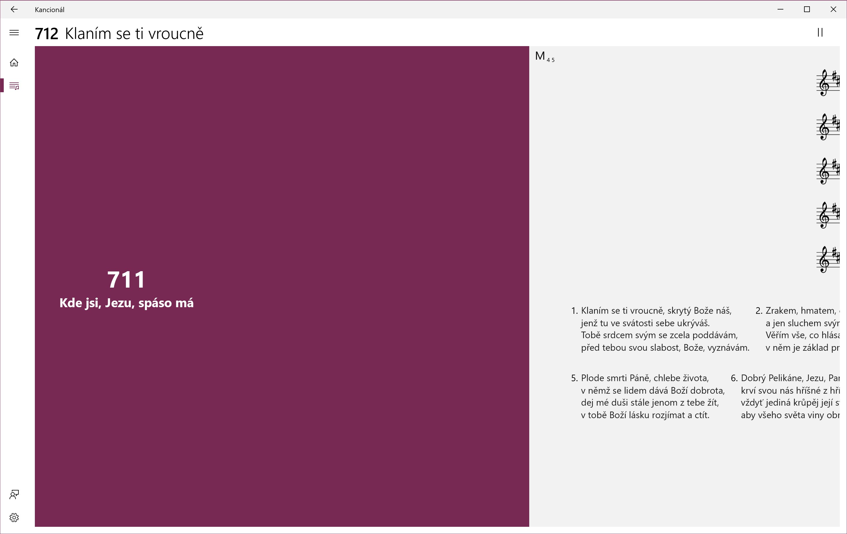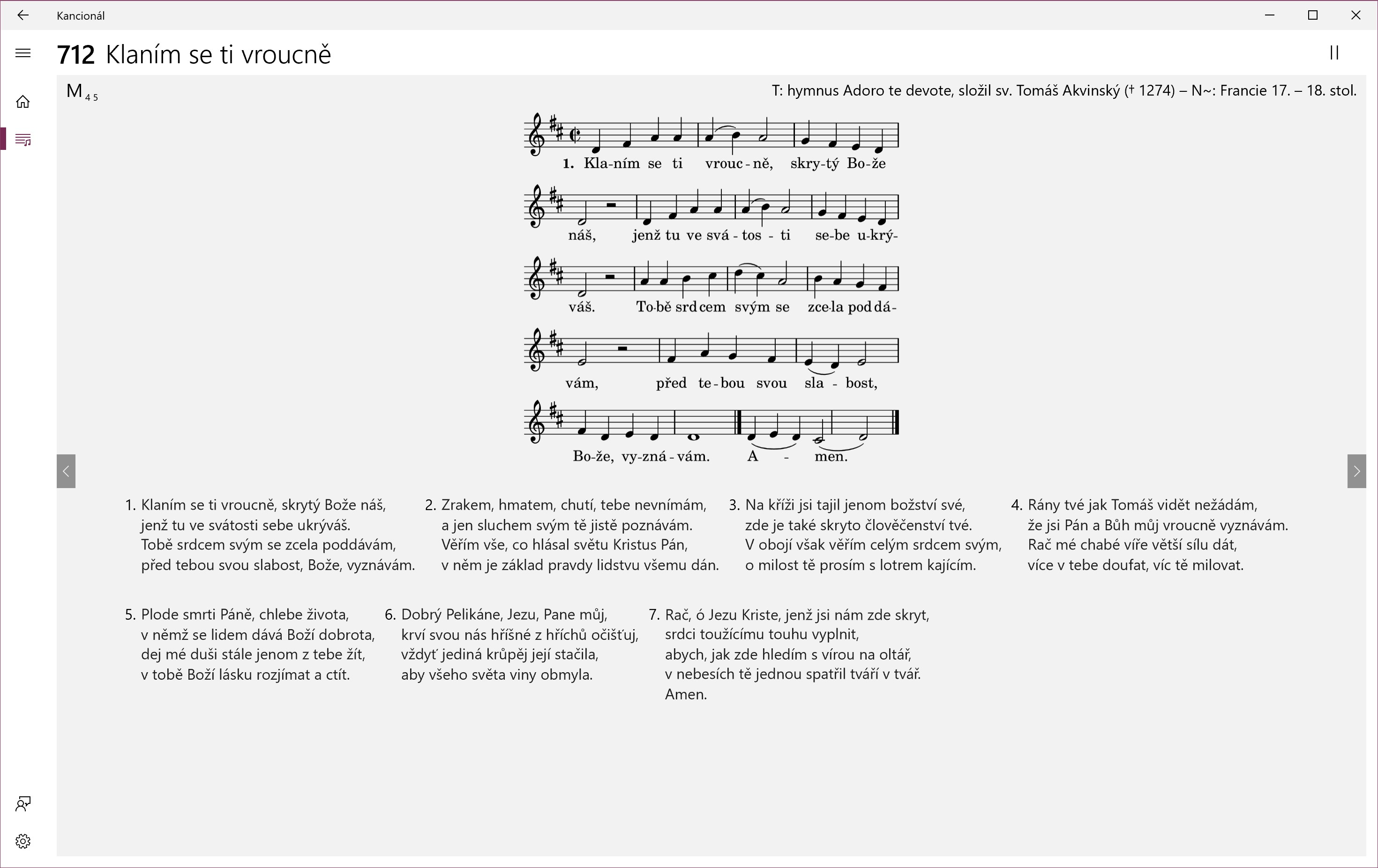 Tato univerzální aplikace pro Windows umožňuje offline přístup ke všem písním webové verze projektu elektronického kancionálu (Kancional.cz).