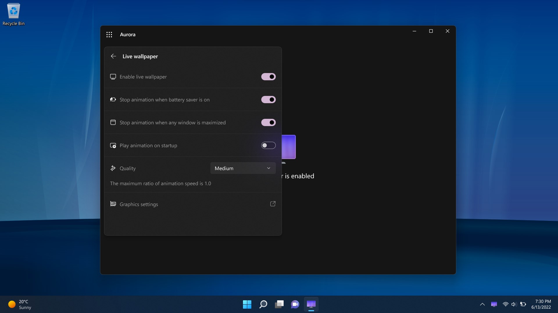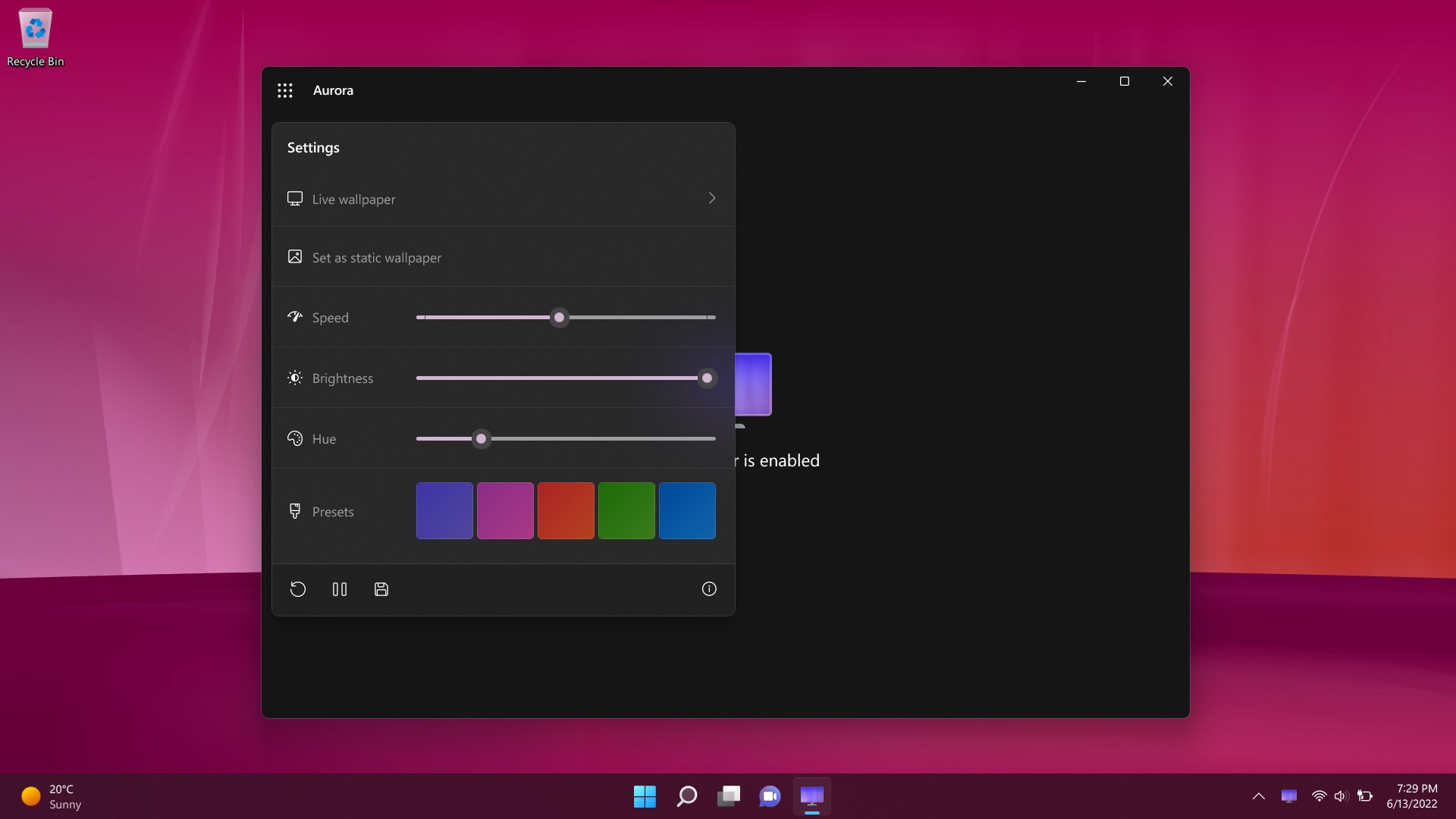 Do you know the breathtaking animation called Aurora? It's a beautiful play of colors that makes you feel calm and relaxed. It perfectly blends with taskbar and other elements of your desktop like icons and widgets. Now you can see it in this modern app and set it as fixed or live wallpaper!