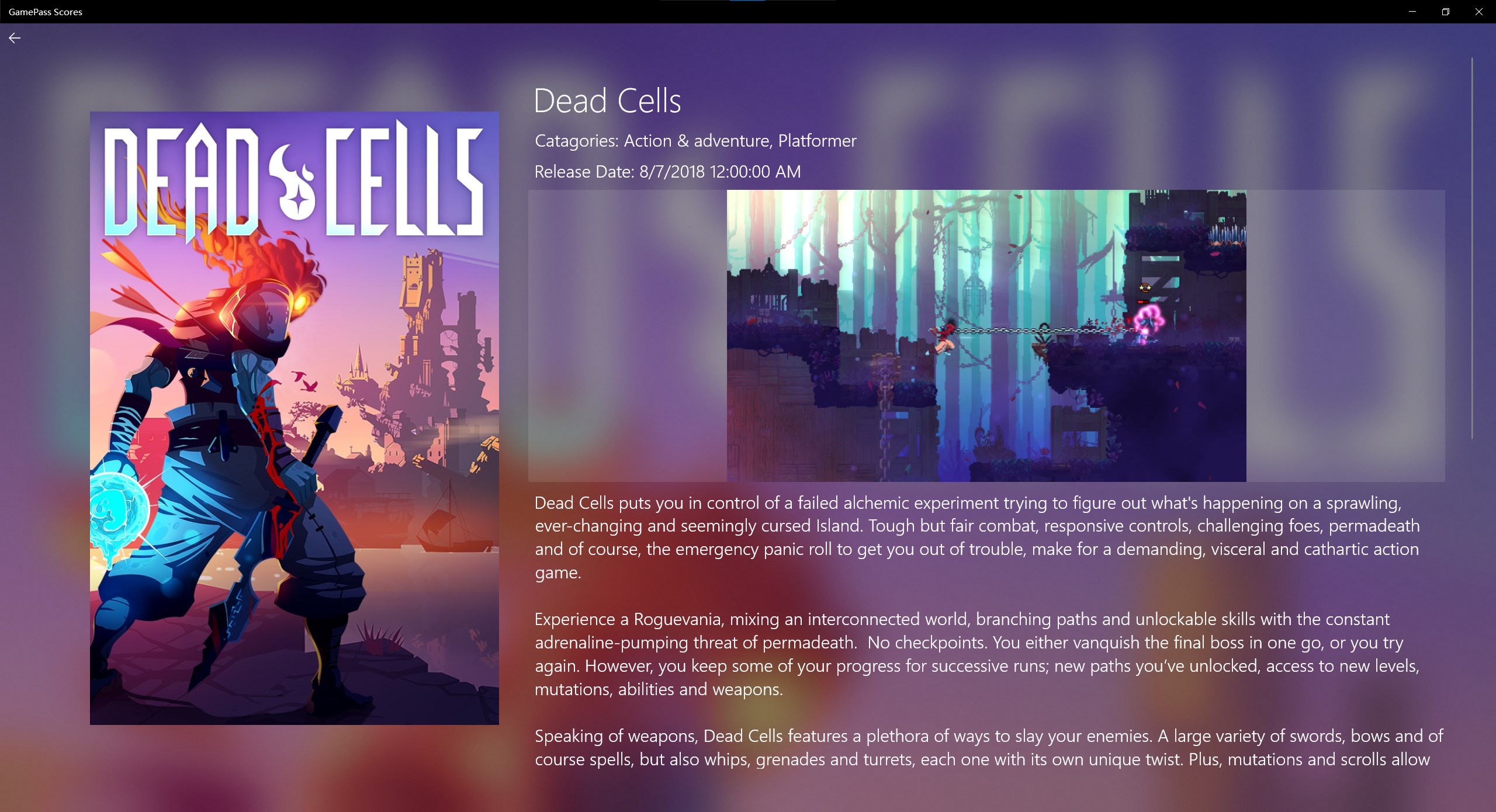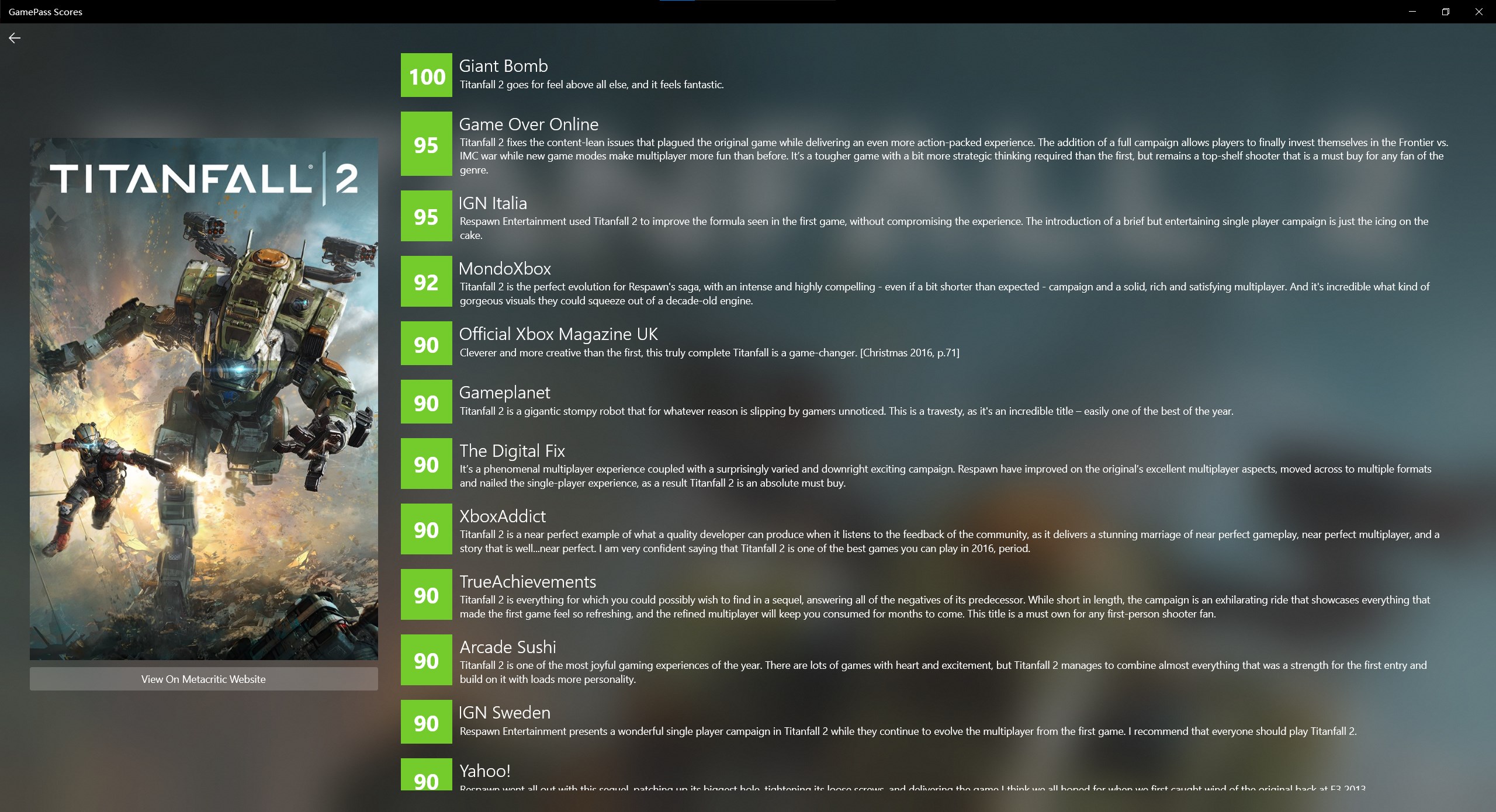 Find games that is in PC and Xbox Game Pass Library with their Metacritic score.Search for Games that are in PC and Xbox Game Pass library.Use Fluent Design!List Metacritic reviews.