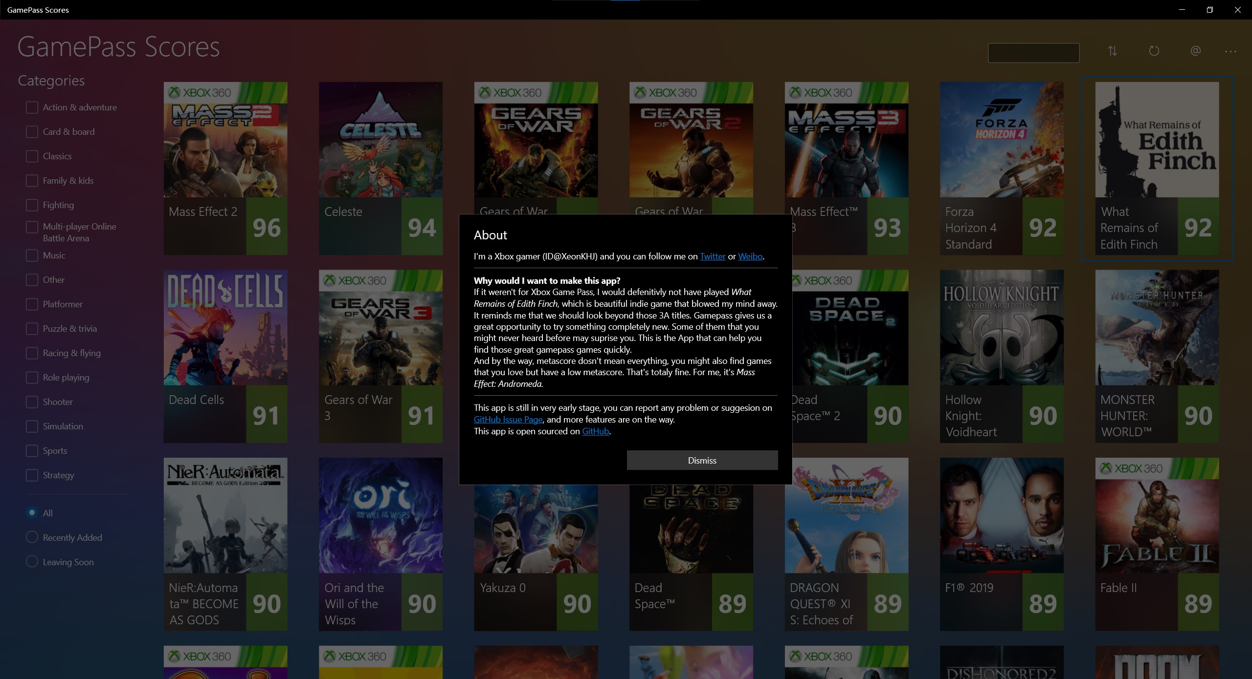 GamePass Scores is a simple app that list Xbox Game Pass games with their Metascores. Xbox Game Pass gives us great opportunity to play a lot of games. It will be a good tool to find some awesome game that you never play or heard before, many of which may surprise you!