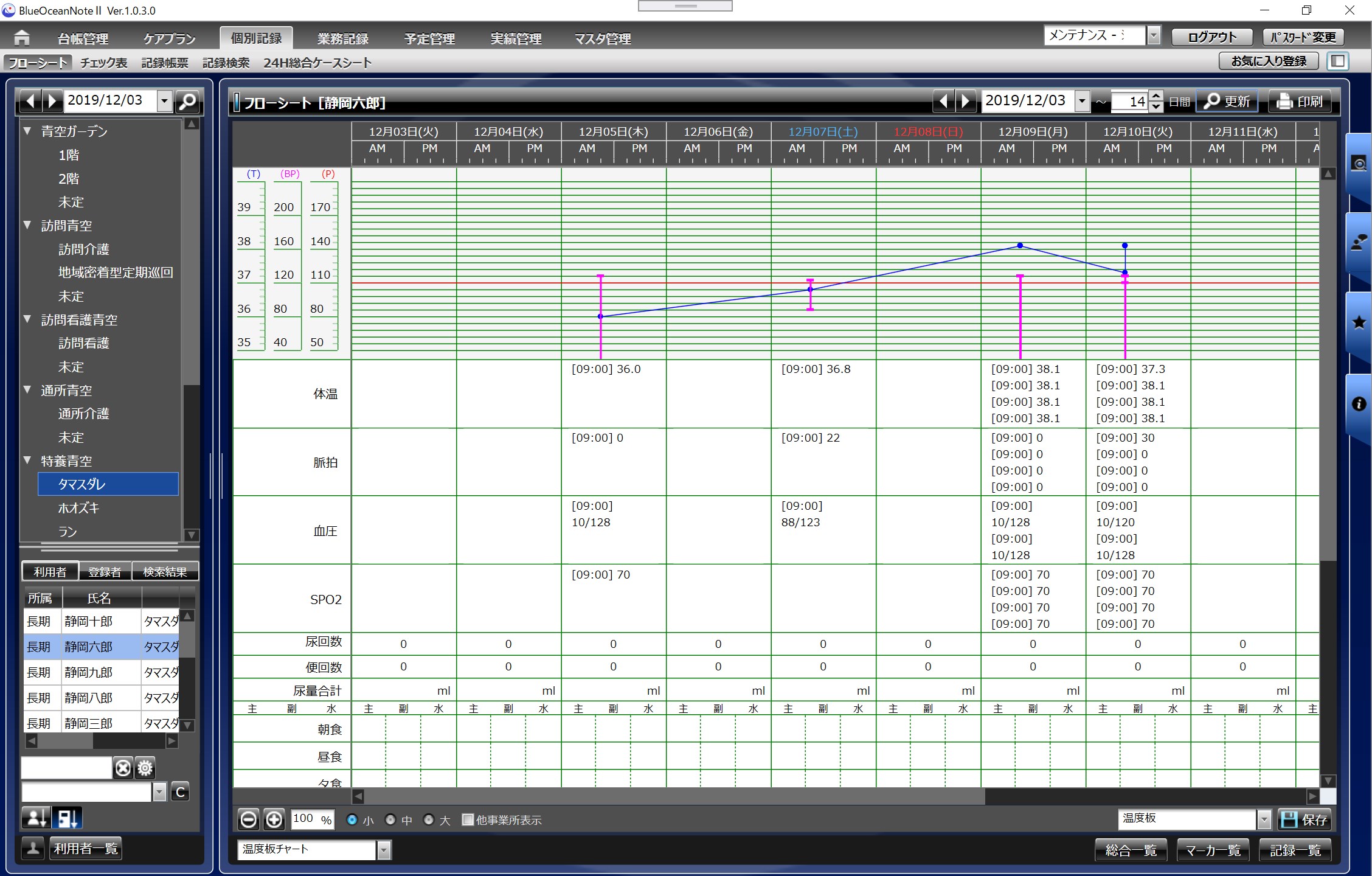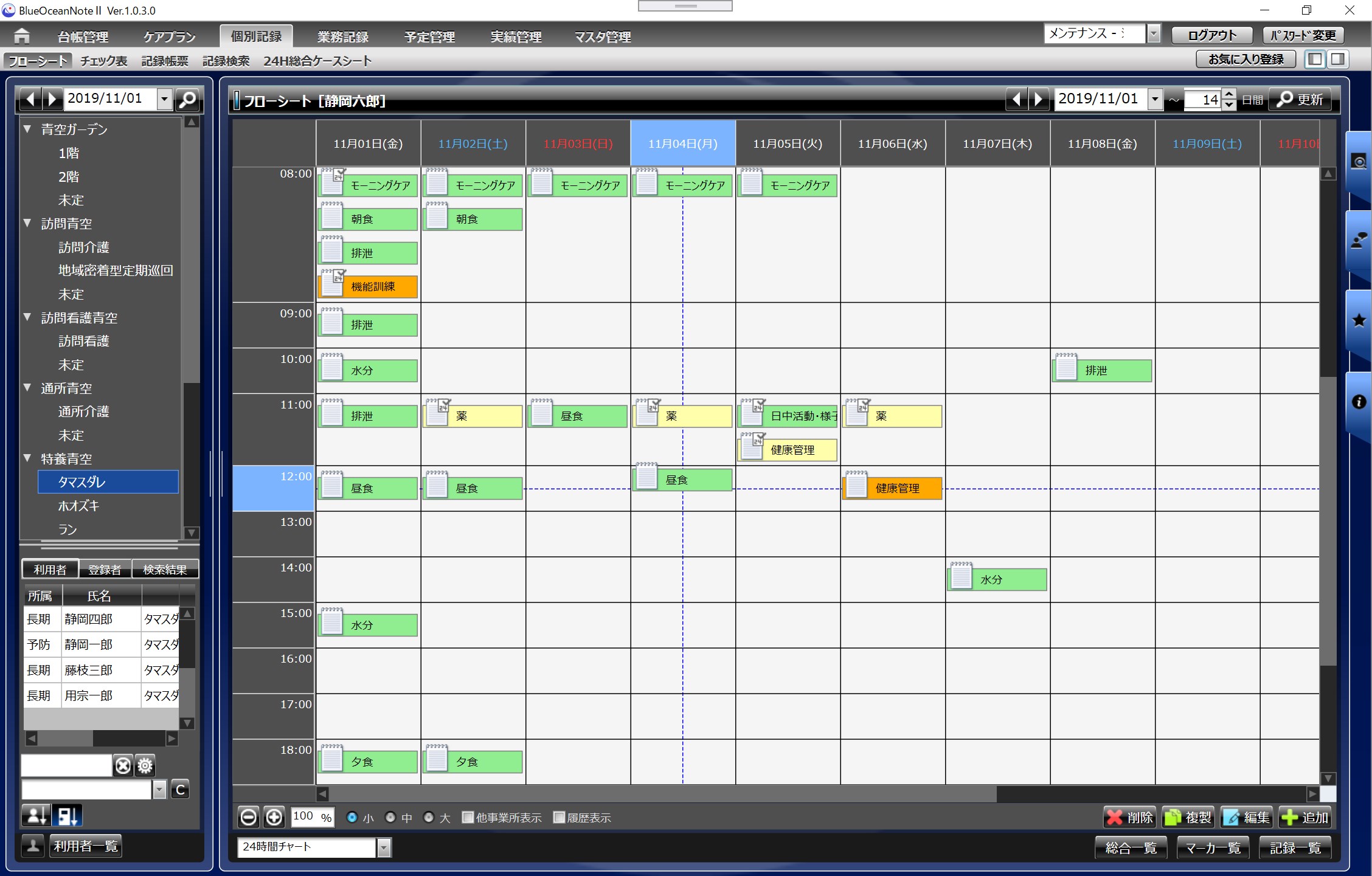24時間総合ワークシート(24時間ケアプランの実施記録をワンクリックで作成できる手書き感覚のワークシートです)チェック表形式記録管理(手書き感覚のチェック表形式での記録一括作成機能)レポート管理(各種プロファイル、アセスメント、評価票などの作成、照会機能)グラフチャート(各種温度板、食事・水分摂取グラフ、排泄チャート等表示機能)フローシート記録管理(各種ケア記録作成、照会等機能)