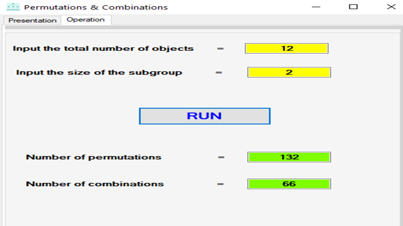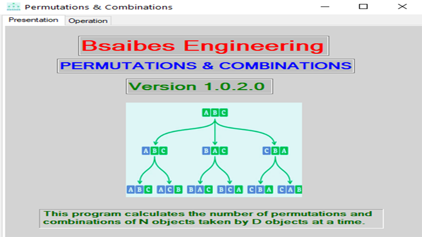 This program calculates the number of permutations and combinations of N objects taken by D objects at a time.