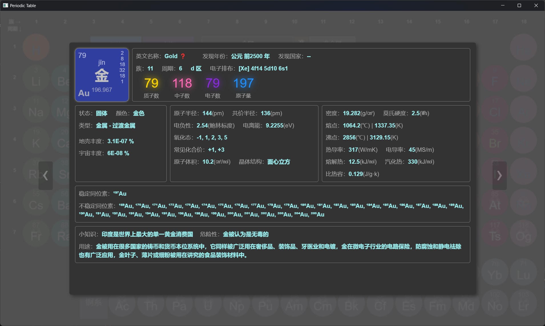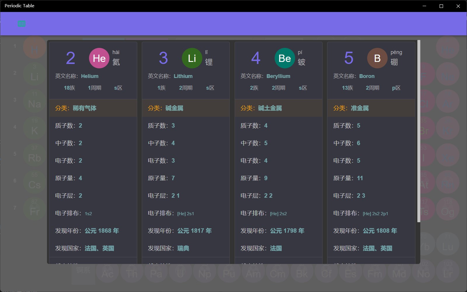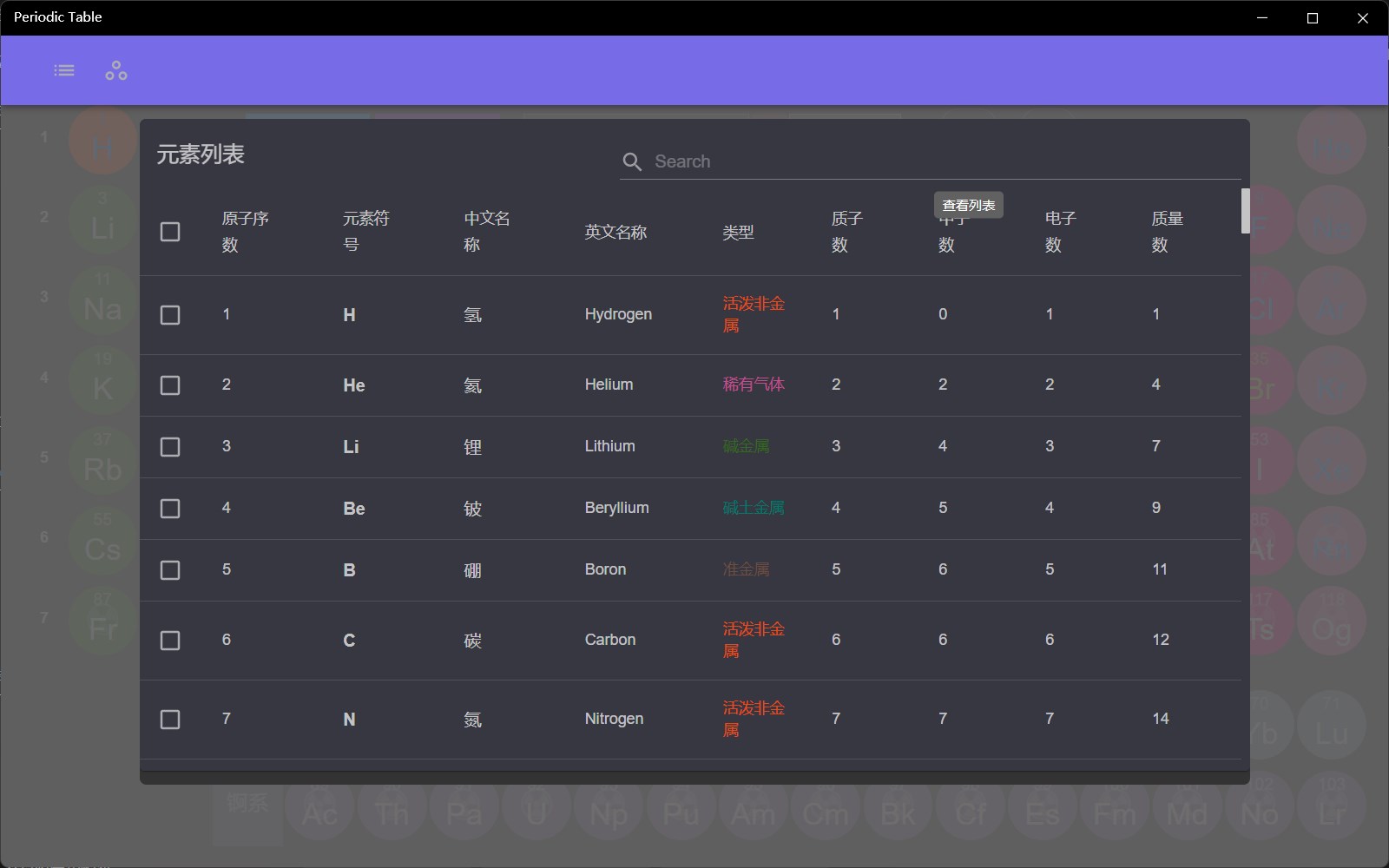 The periodic table is a specific form of the periodic law expressed in a table, which reflects the internal structure of the atoms of the elements and the laws of their interconnection. This app can view the basic information of various elements, you can view elements in the form of lists or groups, and you can compare 2-4 elements.