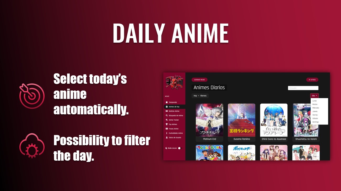 - Daily Animes: Choose the current day automatically. Also, you can filter by the day of the week.