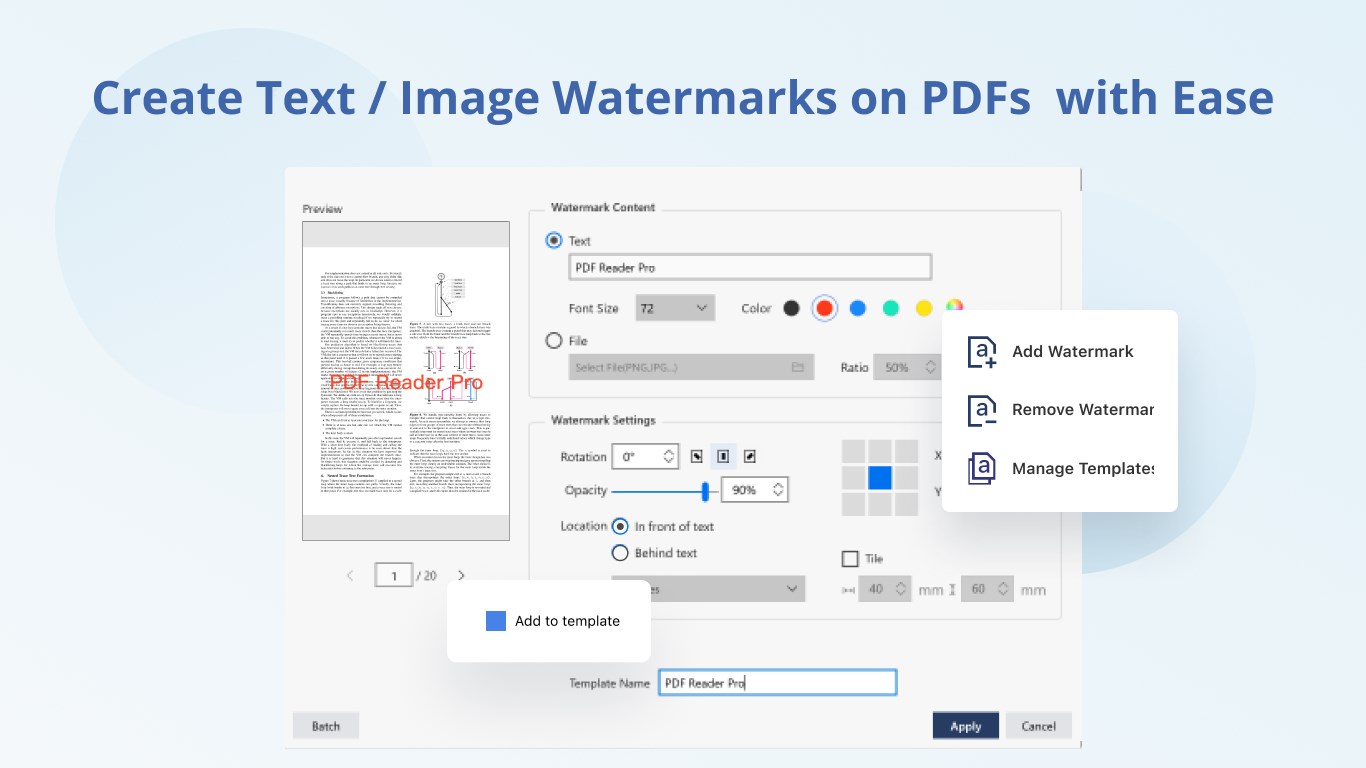 • Add watermarks to your document or batch add watermarks to PDFs (image watermark and text watermark are provided).