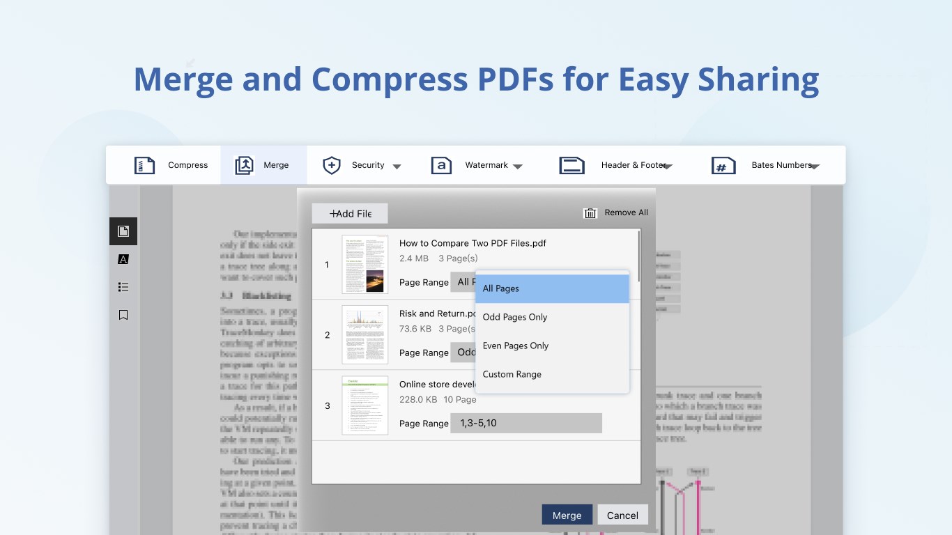 Combine multiple PDF files into a new document in your desired order. Or you can select specific pages of a file to merge.