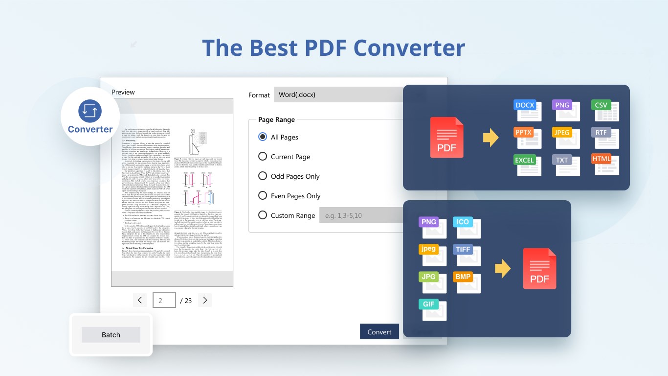 • Quickly convert PDFs to Word, Excel, PowerPoint, Text, RTF, CSV, Images.
