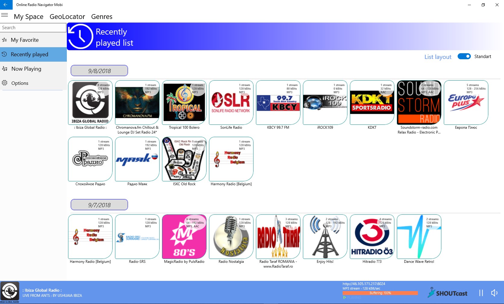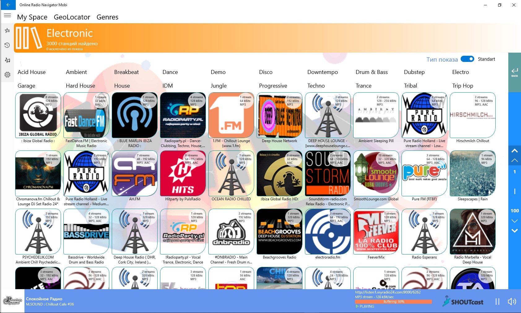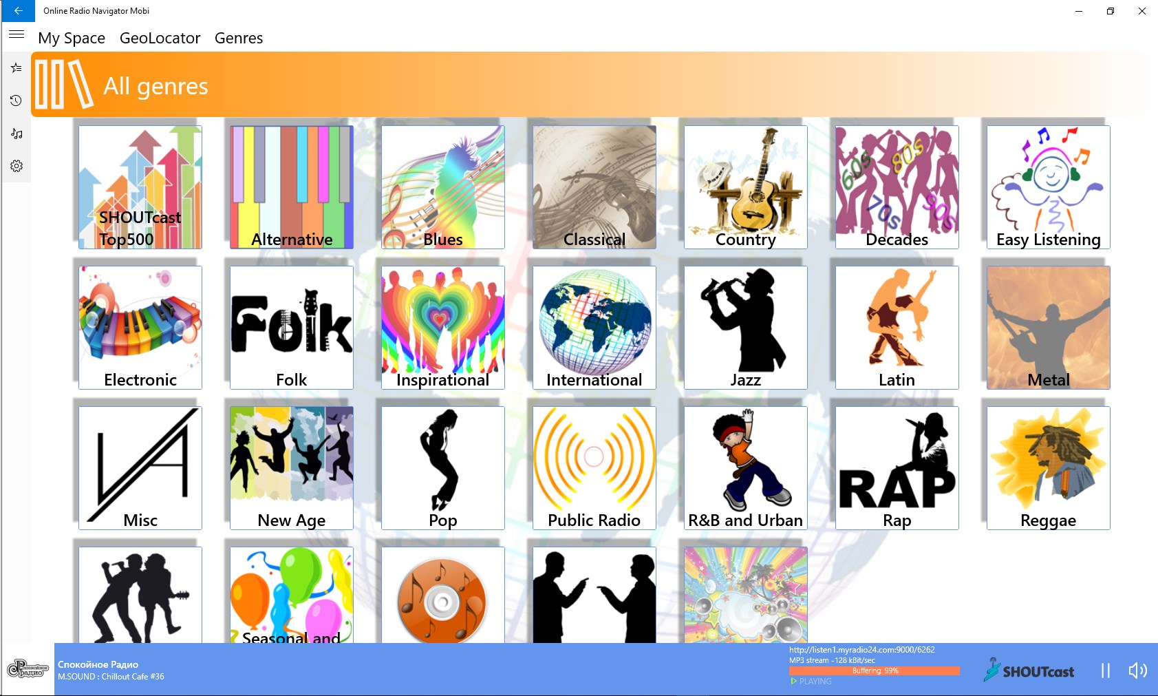 Online Radio player> 100,000 active stations, all countries of the world15,000 genres, castes, geo-referrals