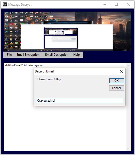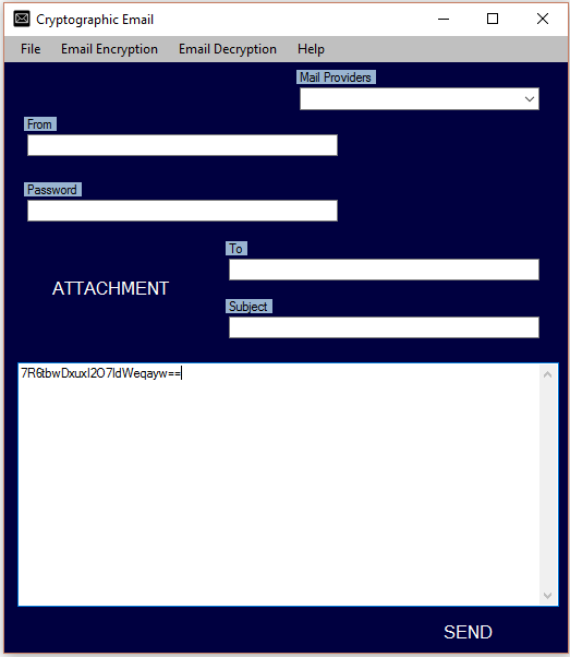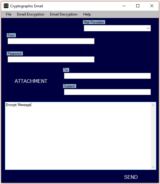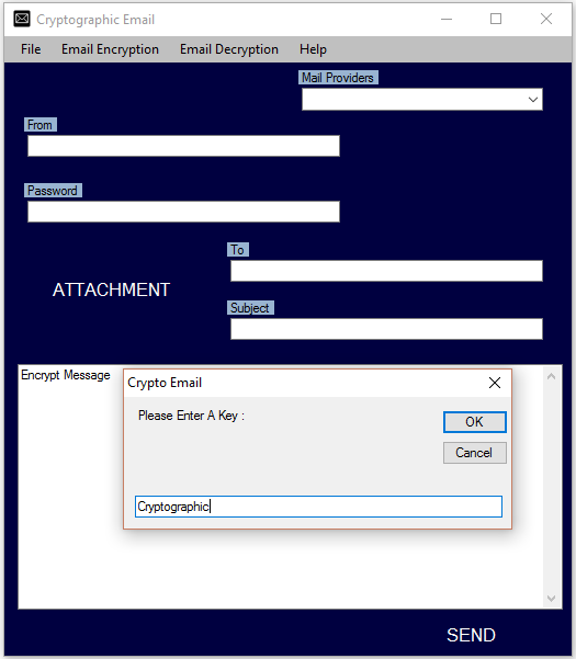 Using MD5 algorithm Cryptographic Email allows users to encrypt email text in unreadable format. During encryption users are prompted to enter a word of choice as a encryption key. Afterwards users can email text in encrypted format to others. The application also allows users to decrypt MD5 encrypted email text. Users on both ends need to be aware of the key to perform the encrypt/decrypt process. Limits of one attachment per email. Supports mail providers Gmail, GMX, Yahoo, Hushmail, Hotmail, iCloud, AOL, Lycos, Zoho, Mail.Com, Fastmail, Rackspace, Rediffmail and Run Box