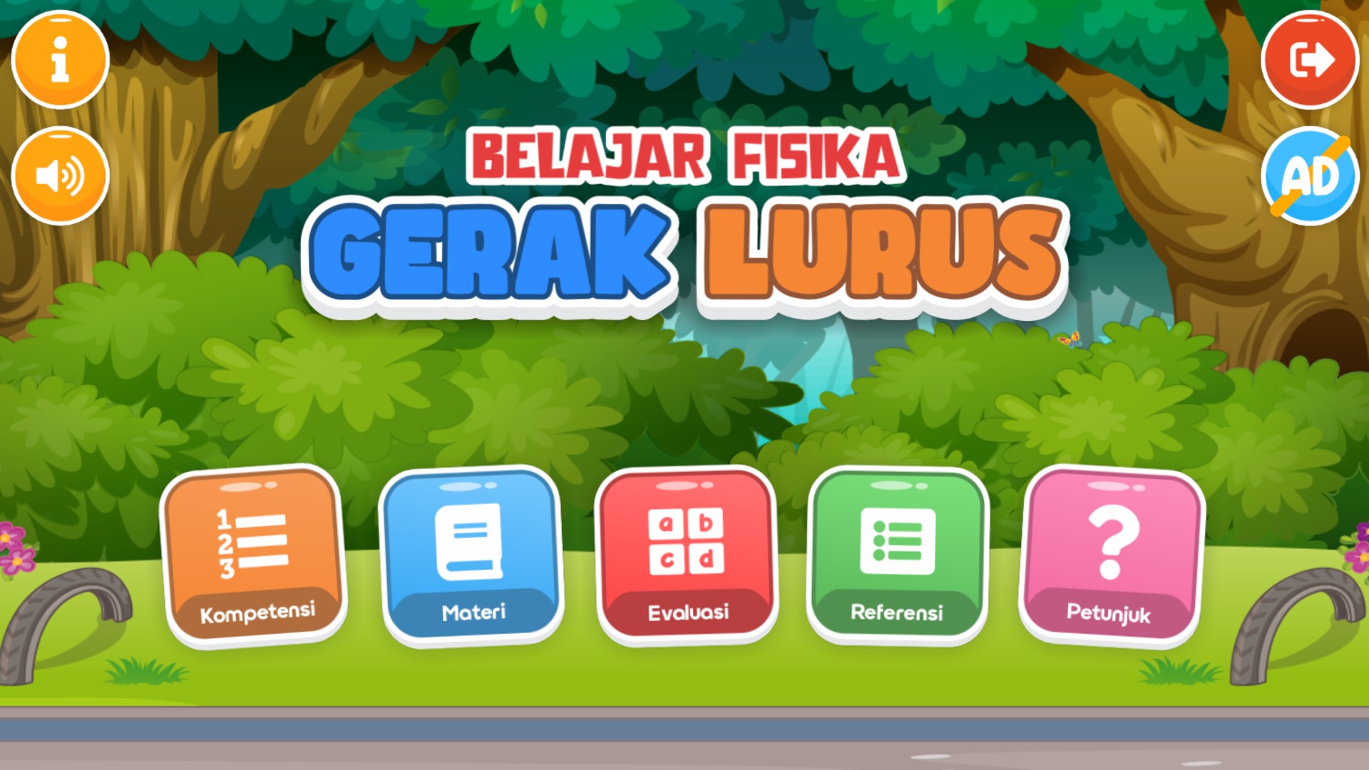 Pada aplikasi ini terdapat 3 menu materi utama yang terdiri dari materi Gerak Lurus Beraturan (GLB), Gerak Lurus Berubah Beraturan (GLBB), Gerak Vertikal Atas (GVA), Gerak Vertikal Bawah (GVB), dan Gerak Jatuh Bebas (GJB).